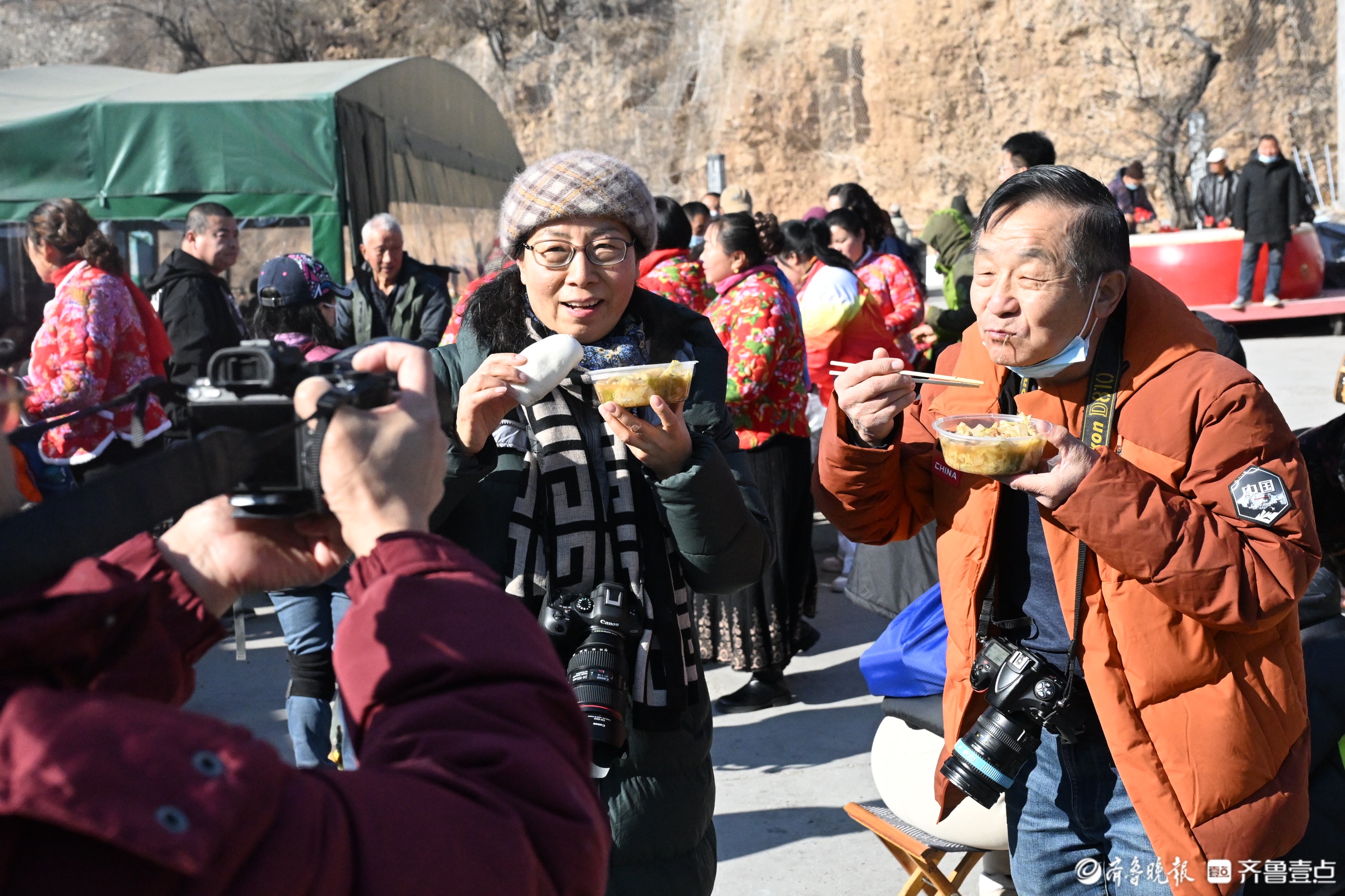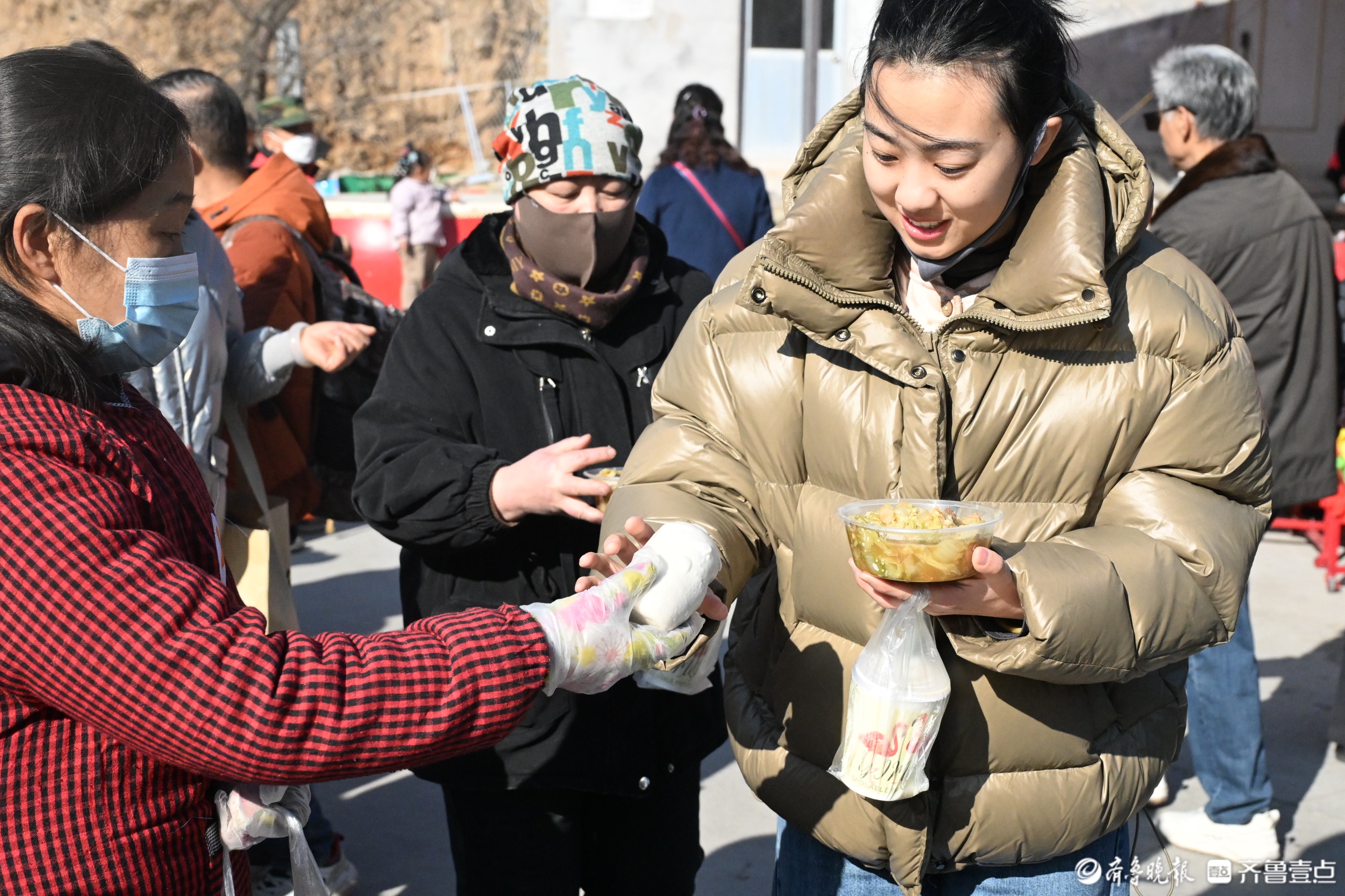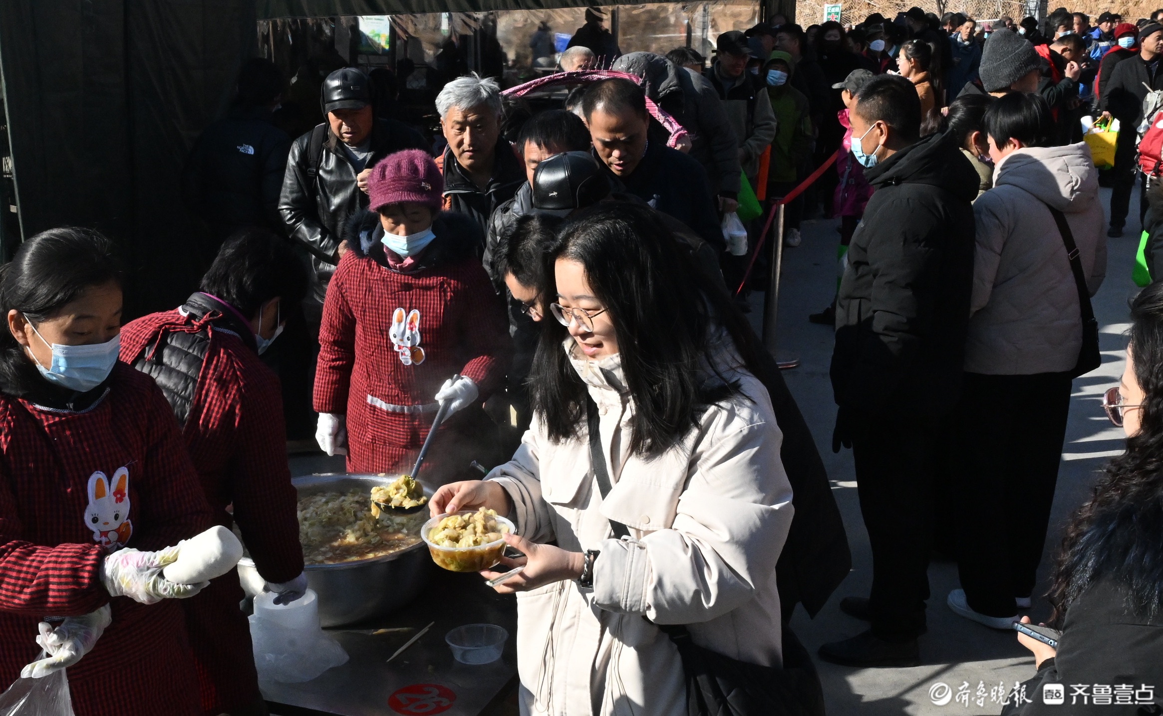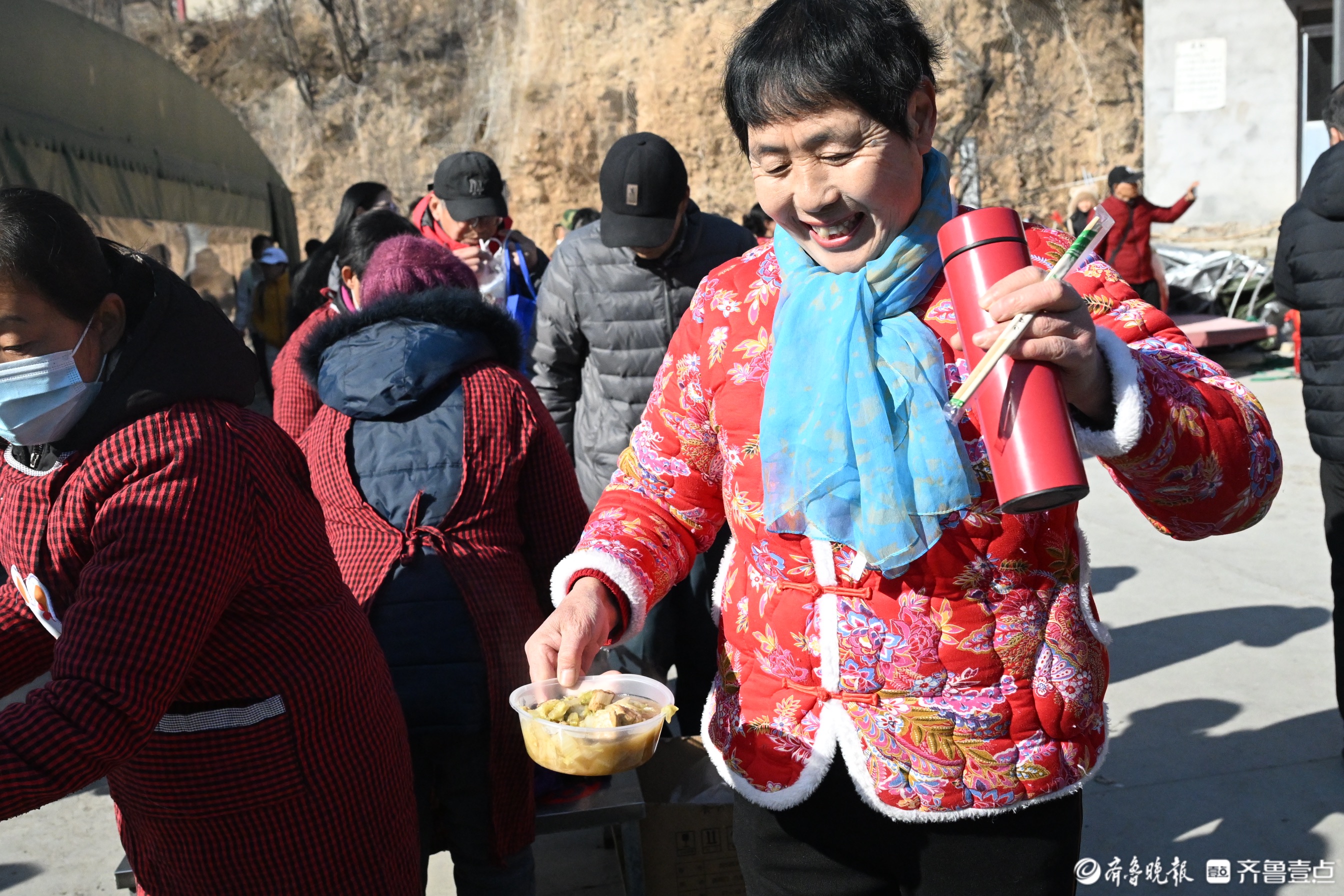 每逢节假日,地处深山里的淄博市淄川区太河镇东东峪村锣鼓喧天,来自四面八方的游客从公交摆渡车上下来。春节前,在长约600多米的村内主干道上,路边的新春非遗大集让游客们边走边逛,兴致勃勃。“出锅啦出锅啦!快去排队!”不知道是谁吆喝了一声,转眼间,主干道尽头的小广场上,已经排出100多米的长龙。队伍的最前排,东东峪村的村书记朱全祥正在为游客们盛菜,桌子上一大盆白菜五花肉炖豆腐冒着热气,菜香四溢,“来来来,端好了,小心烫啊!”原来,是朱全祥书记的大锅菜出锅了。