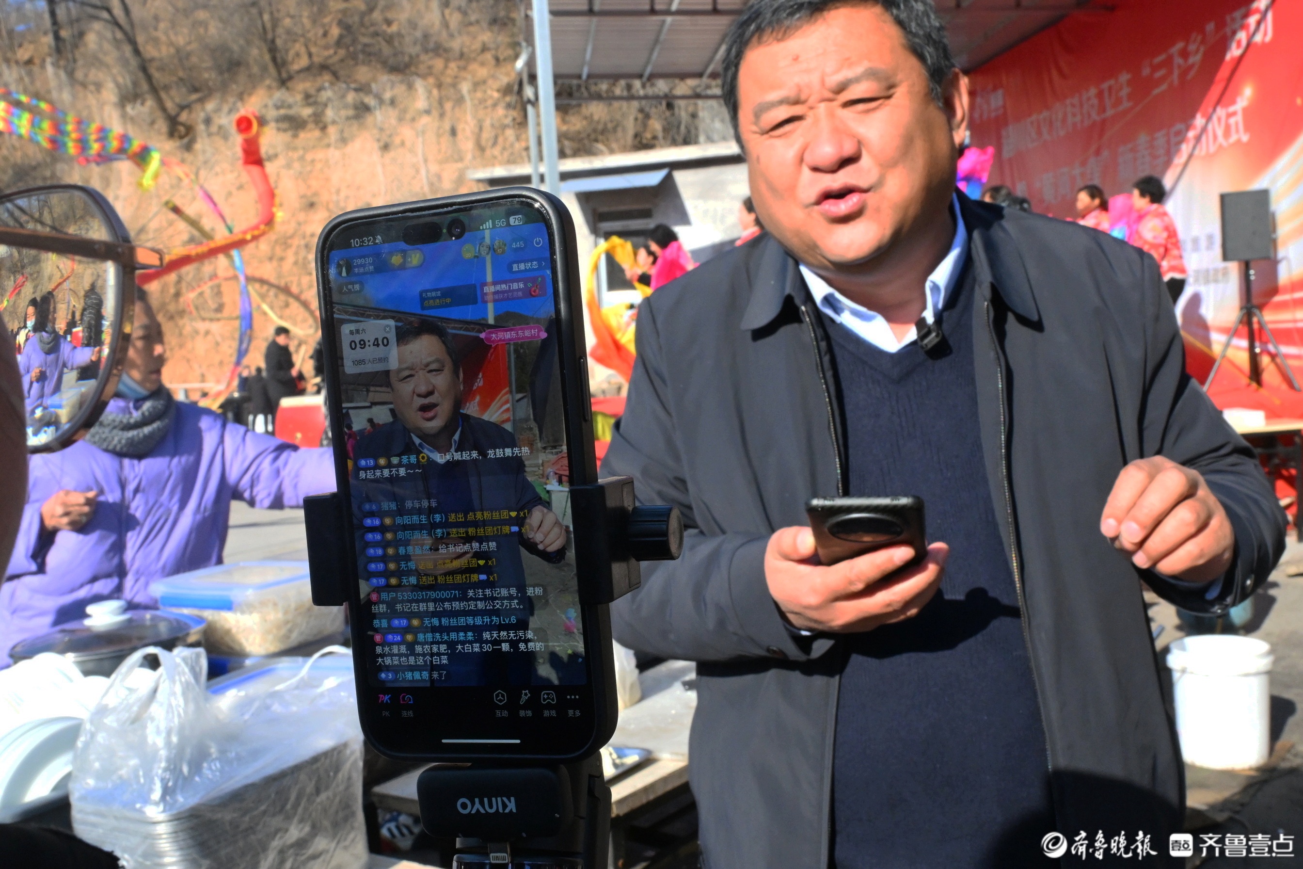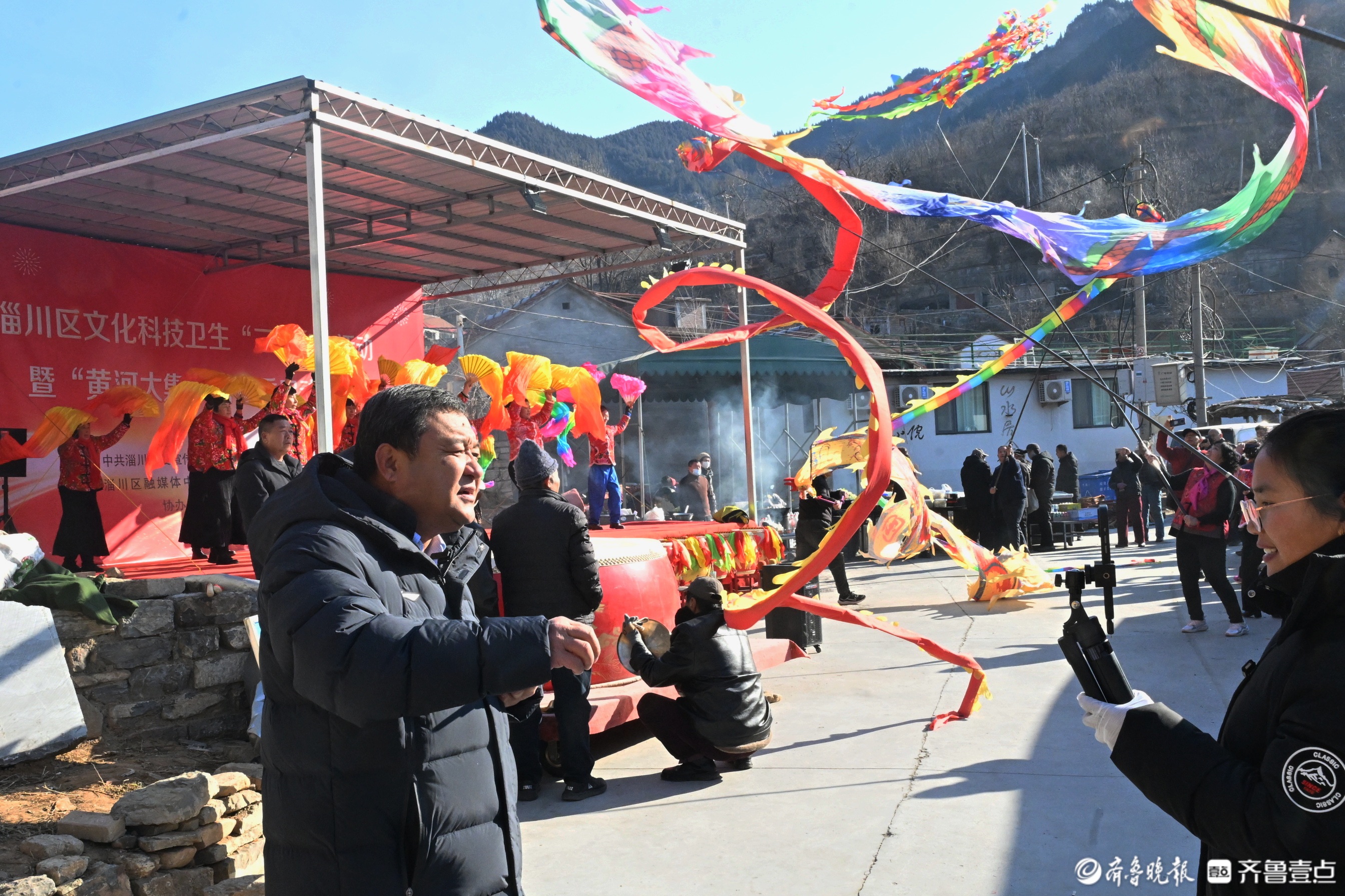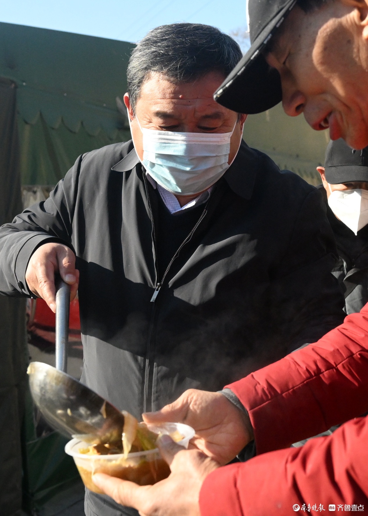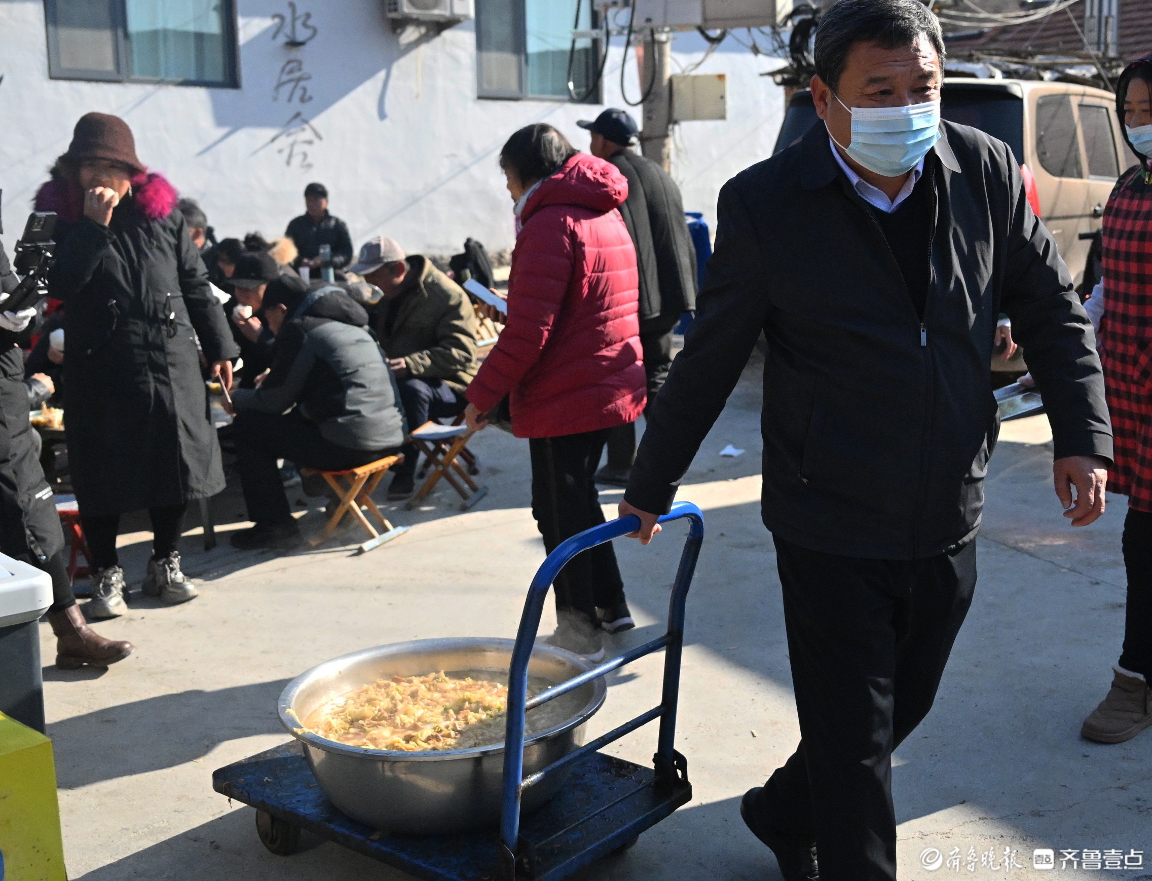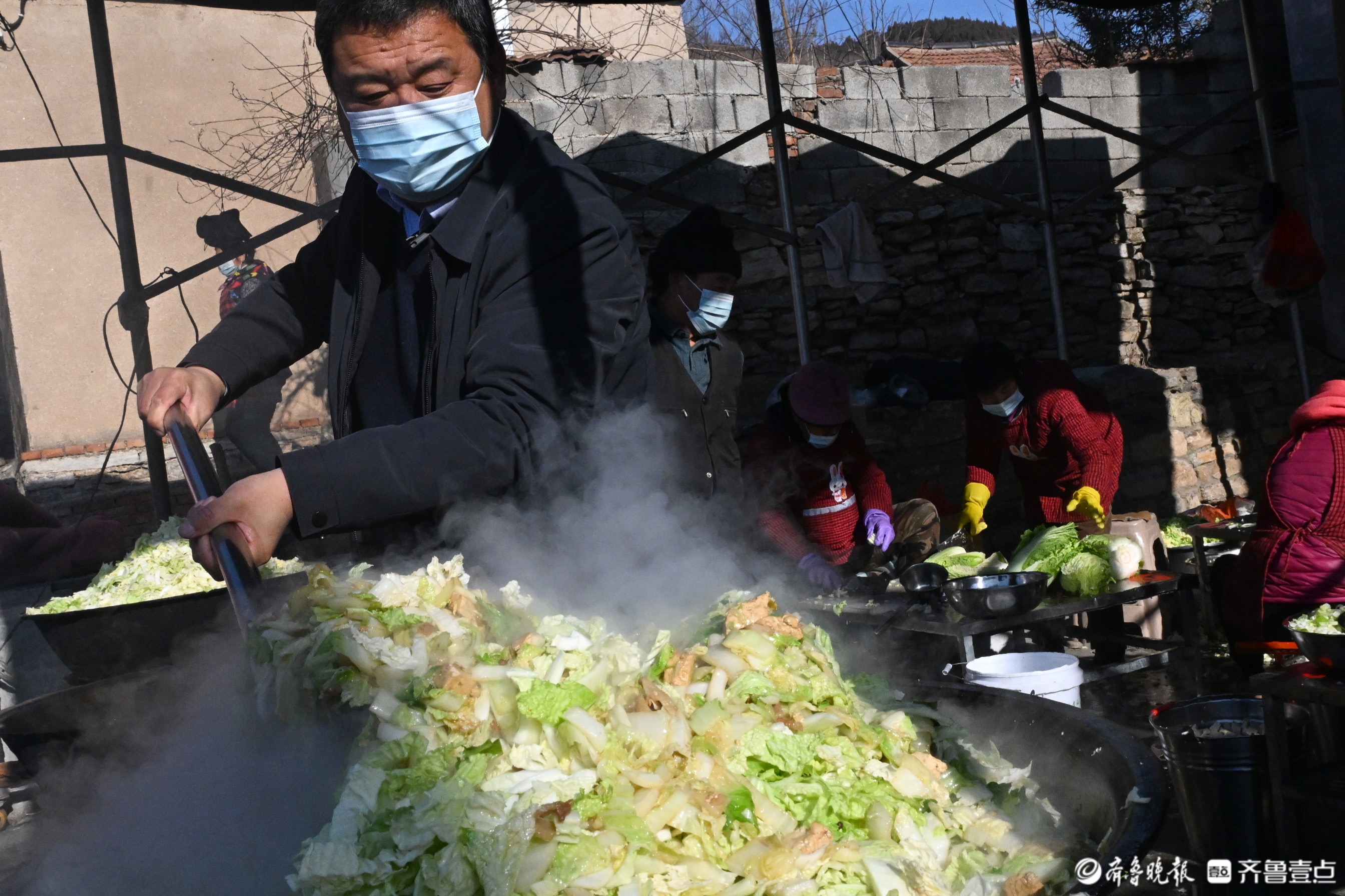 每逢节假日,地处深山里的淄博市淄川区太河镇东东峪村锣鼓喧天,来自四面八方的游客从公交摆渡车上下来。春节前,在长约600多米的村内主干道上,路边的新春非遗大集让游客们边走边逛,兴致勃勃。“出锅啦出锅啦!快去排队!”不知道是谁吆喝了一声,转眼间,主干道尽头的小广场上,已经排出100多米的长龙。队伍的最前排,东东峪村的村书记朱全祥正在为游客们盛菜,桌子上一大盆白菜五花肉炖豆腐冒着热气,菜香四溢,“来来来,端好了,小心烫啊!”原来,是朱全祥书记的大锅菜出锅了。
