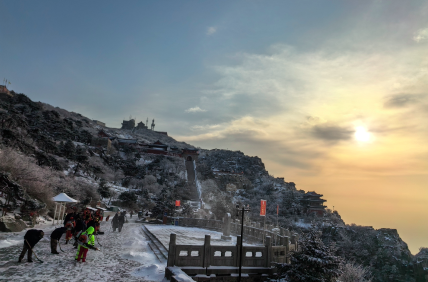 12日12时,泰山景区发布消息,东御道游览路已恢复正常开放。预计明天上午(2月13日)桃花源旅游公路恢复运营,目前在清理积雪积冰。