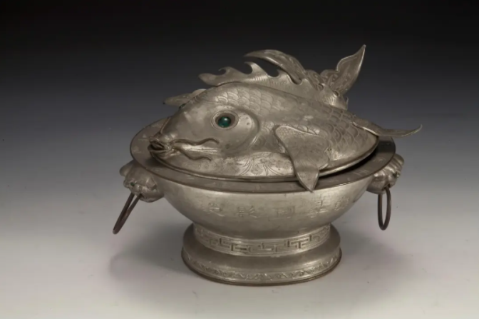 △清·錾刻诗文嵌玻璃鱼形锡烫锅