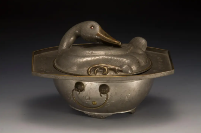 △清·錾刻诗文点铜鸭形锡烫锅