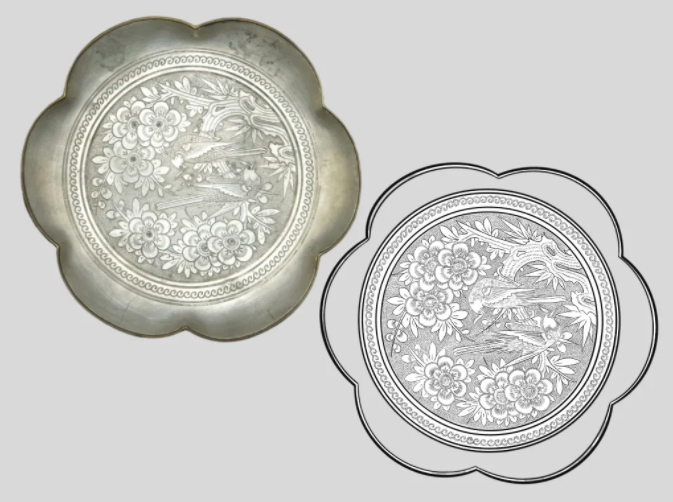 △清·錾刻花鸟纹锡盘 盘上图案喜鹊和梅花寓意喜上眉梢