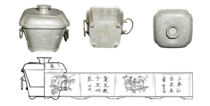 锡餐具是孔府因婚丧嫁娶、祭祀等日常生活中购买或接收的使用器物。从门类上看,有水囤、盘、碟、火锅等。从造型上看,除了上文介绍的仿礼乐器类,还有花式类。