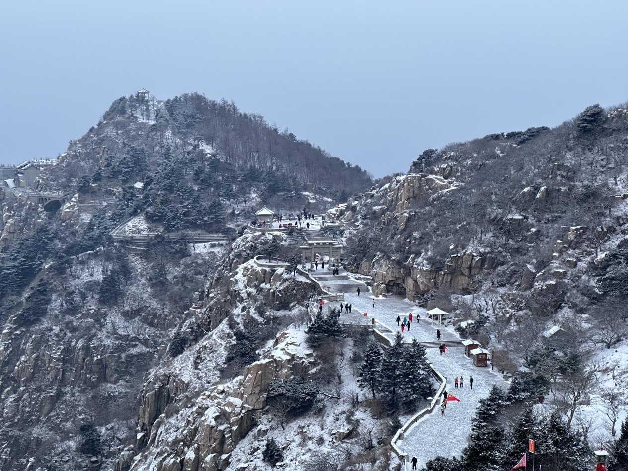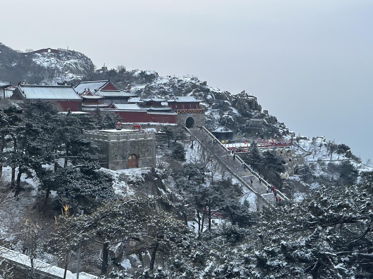 2月20日凌晨,泰山降下小雪。今晨泰山之巅已被白雪覆盖,雪后初霁,朱红墙垣凝上琼花,庄重添一抹剔透,泰山盘道宛如银龙卧脊,整个泰山宛如一幅水墨画。据了解,中天门区域望人松以上稍有积雪,道路通行正常,景区工作人员正在清理积雪。