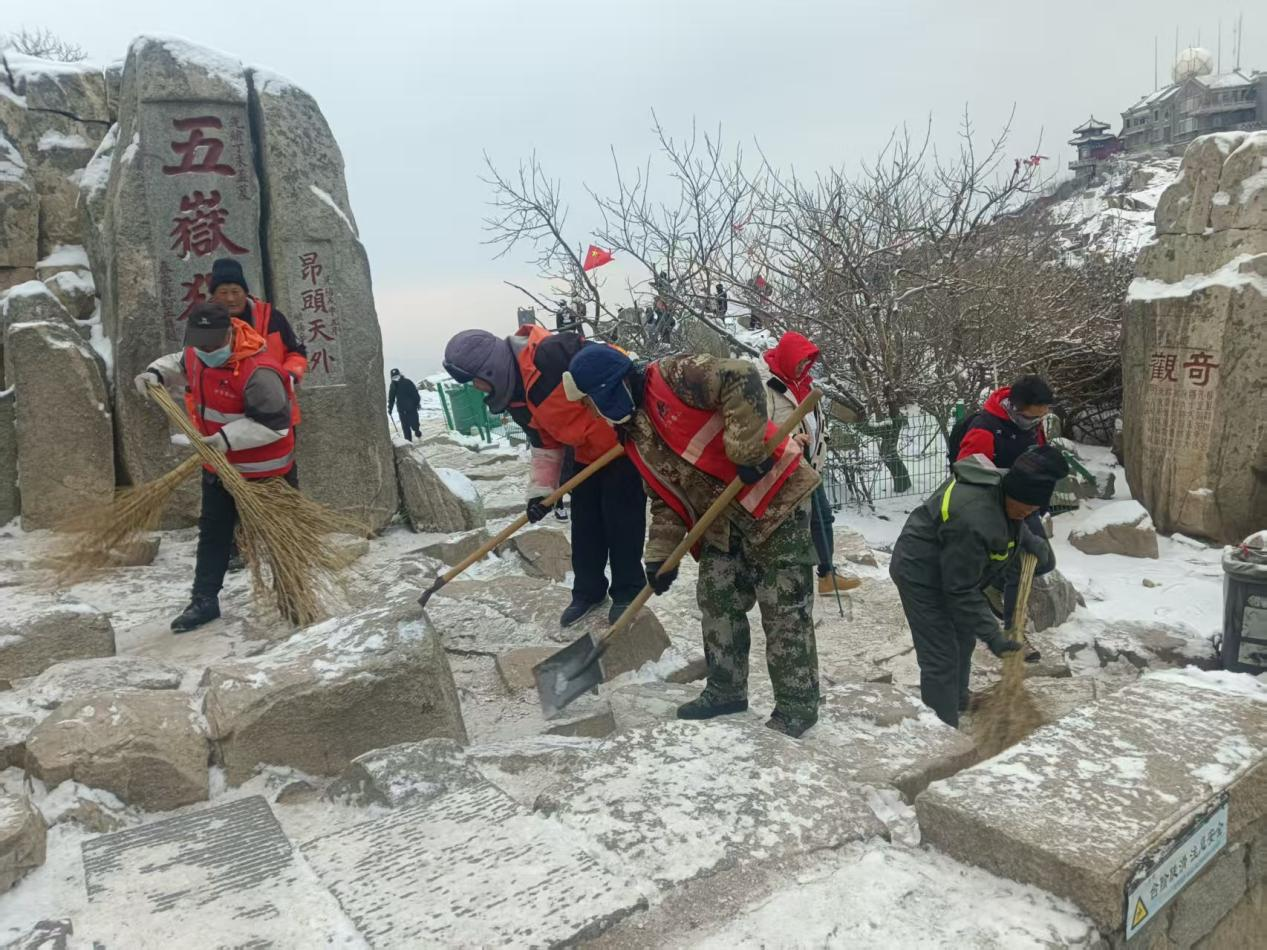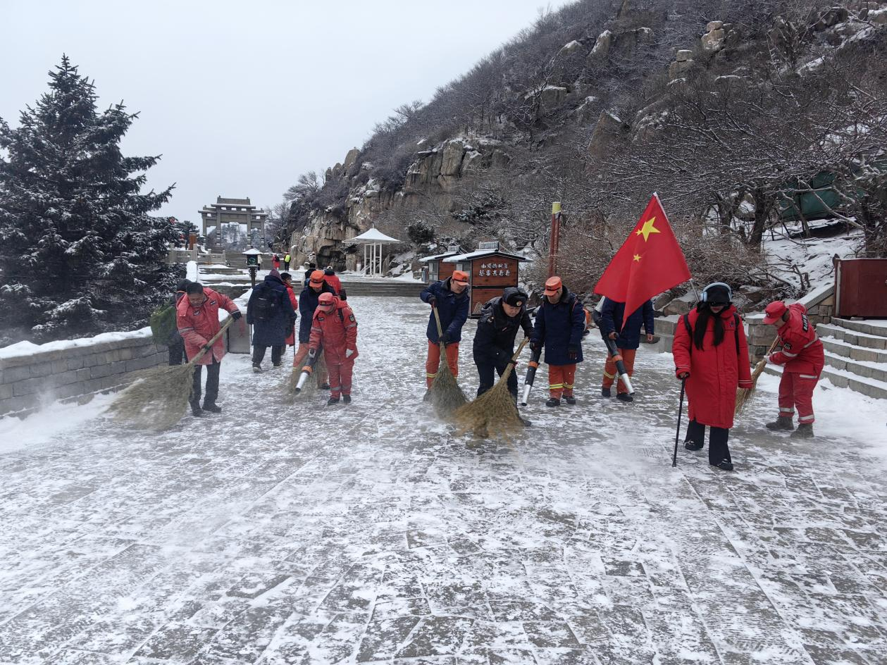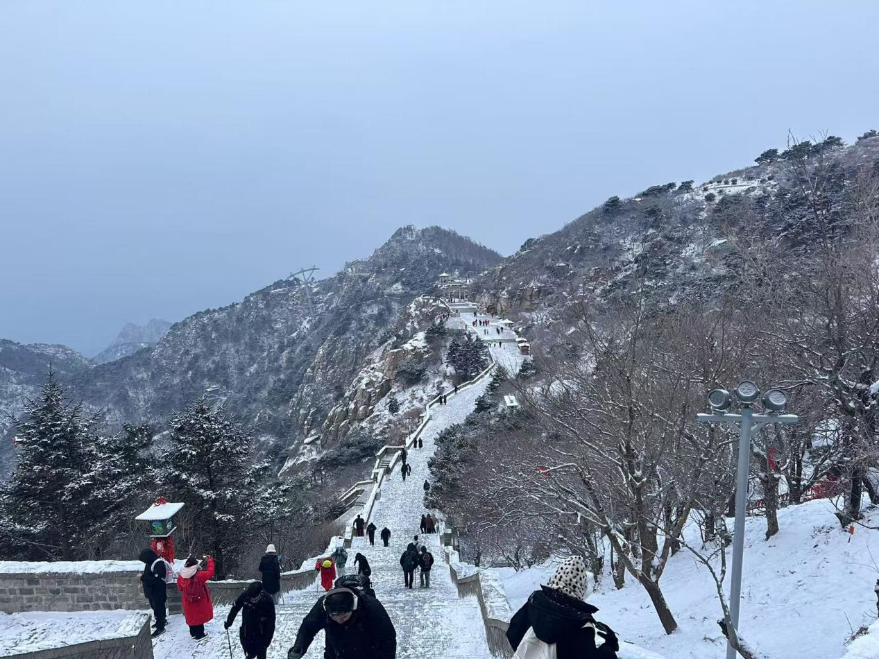 泰山景区发布温馨提示:今日凌晨代顶降下小雪,虽经景又工作人员及时清理,但道路依然较为湿滑,请游客朋友们谨慎慢行,并做好防滑防寒准备,安全第一!