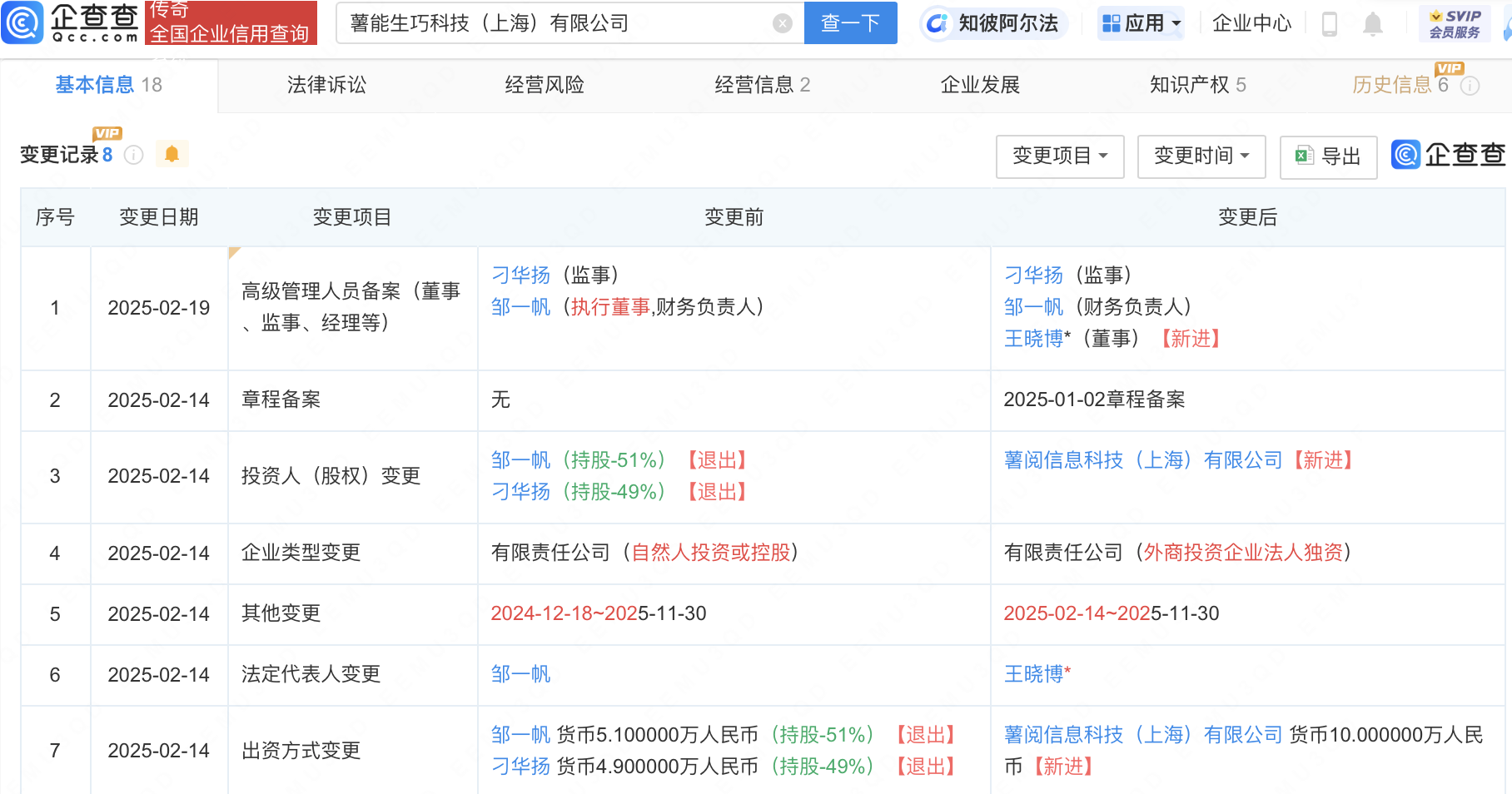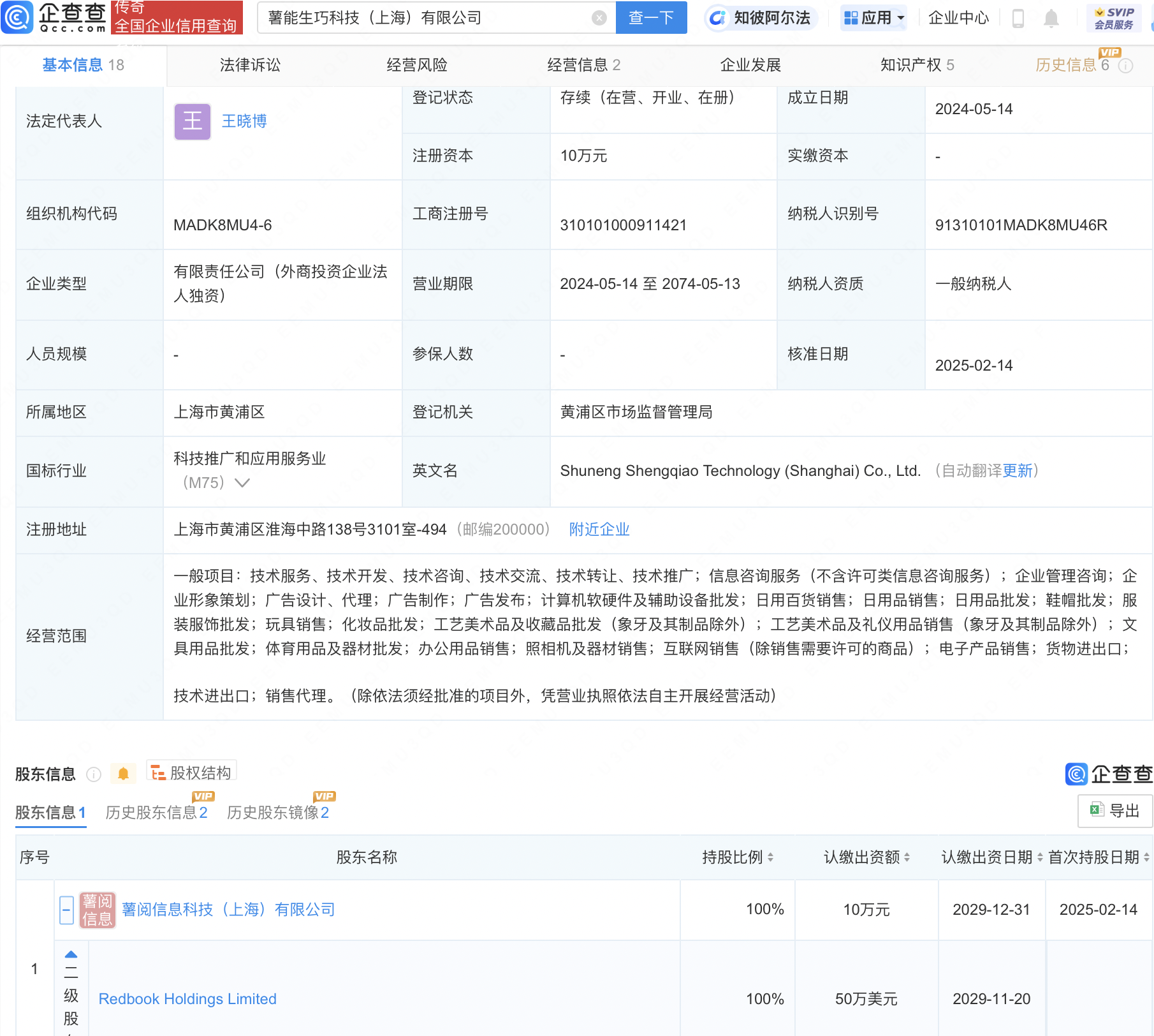企查查APP显示,近日,薯能生巧科技(上海)有限公司发生工商变更,原股东均退出,新增小红书关联公司薯阅信息科技(上海)有限公司为全资股东。企查查信息显示,该公司成立于2024年,法定代表人为王晓博,经营范围包含:计算机软硬件及辅助设备批发;日用百货销售;日用品销售;日用品批发等。(企查查)