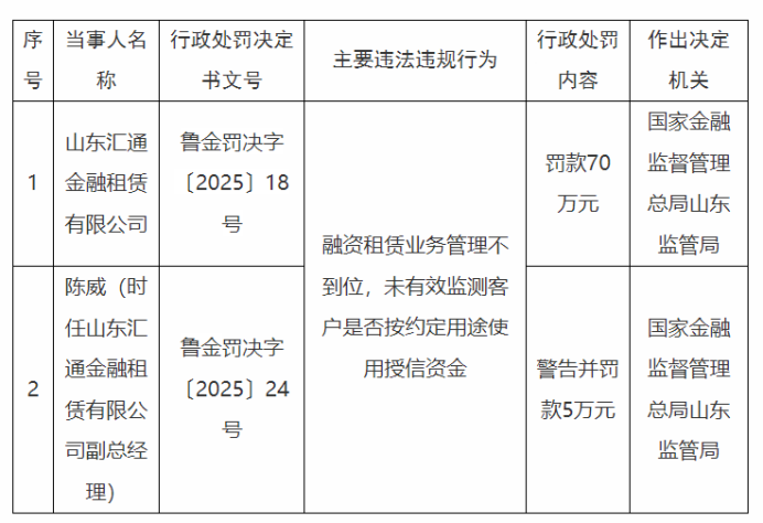 1月26日,国家金融监督管理总局山东监管局公示的行政处罚信息公开表(鲁金罚决字〔2025〕18号)显示,山东汇通金融租赁有限公司因融资租赁业务管理不到位,未有效监测客户是否按约定用途使用授信资金,被罚款70万元。