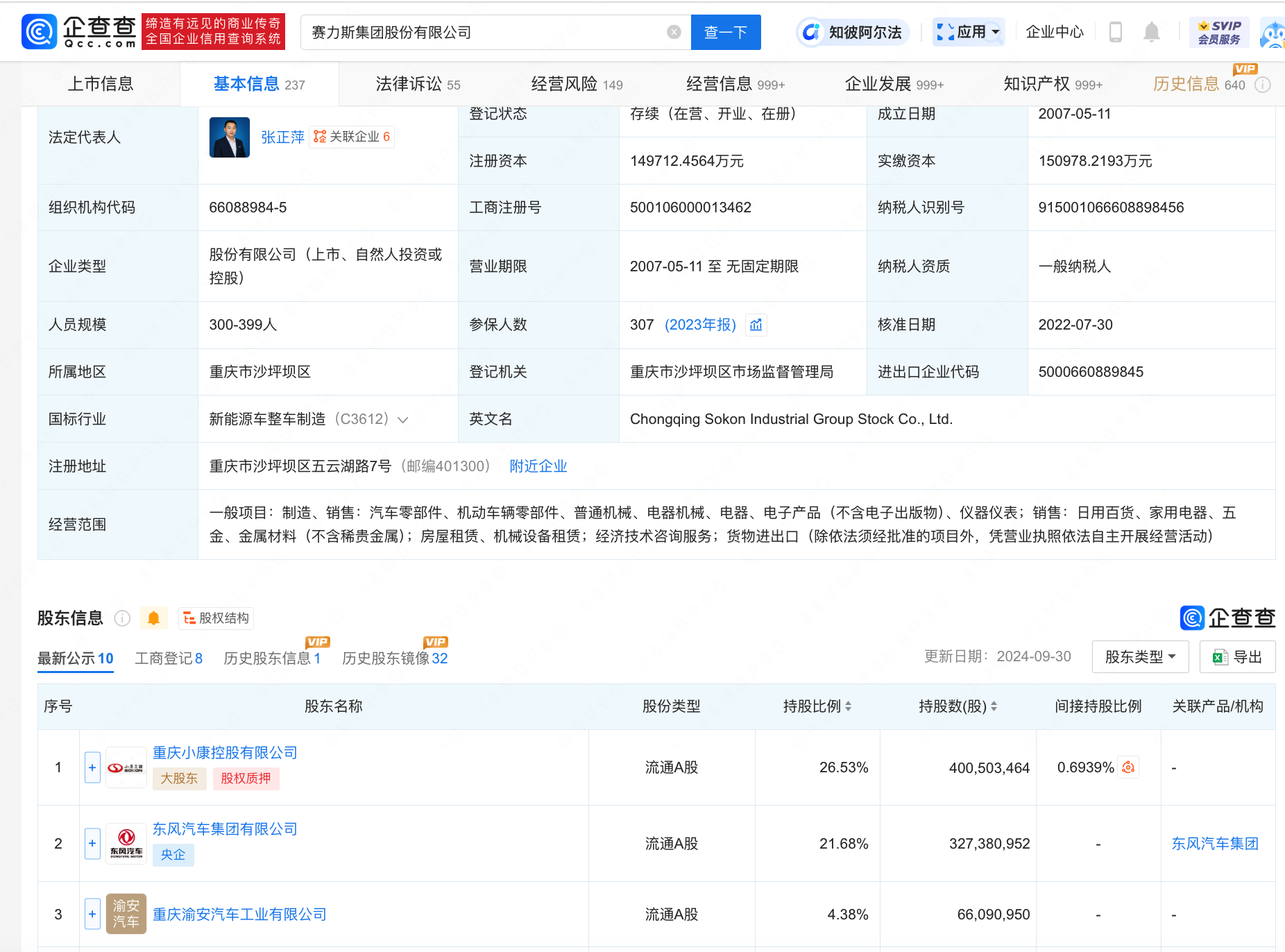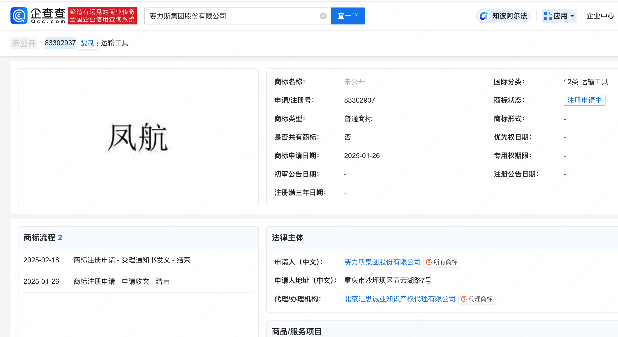 企查查APP显示,近日,赛力斯申请注册多枚“凤航”商标,国际分类含运输工具等,当前商标状态均为注册申请中。企查查信息显示,该公司成立于2007年5月,法定代表人为张正萍,注册资本约15亿人民币,经营范围含房屋租赁、机械设备租赁,经济技术咨询服务等,由重庆小康控股有限公司、东风汽车集团有限公司、重庆渝安汽车工业有限公司等共同持股。(企查查)