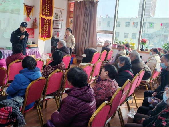 2月27日,红星新村派出所民警走进辖区某写字楼,向参加保健课堂的老年人集中开展安全防范宣传活动,采取讲解案例、发放宣传资料、接受咨询等方式,曝光了“冒充公检法”、“虚假投资理财”、“虚假中奖”等类型的电信网络诈骗的手法和过程,传授了识别技巧、防范策略,警示大家不贪图小便宜、不接陌生人电话、不向陌生人转账汇款,如遇到可疑情况一定保持冷静,及时向家人或警方求助。民警还对防火、防盗、禁毒等安全常识进行了宣讲。共发放宣传资料50余份,接受咨询问题6人次,从源头上减少了案件发生,进一步和谐了警民关系。