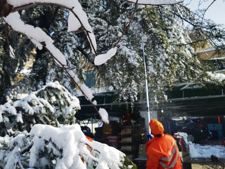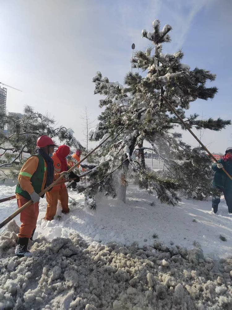 清雪同时,园林工人紧急行动,用竹竿敲打枝头积雪,预防树木断枝,对受损树木进行修剪清理;市政道路维护班组加强巡查,及时修复受损护栏,确保清雪与安全防护同步推进,织密城市安全防护网。