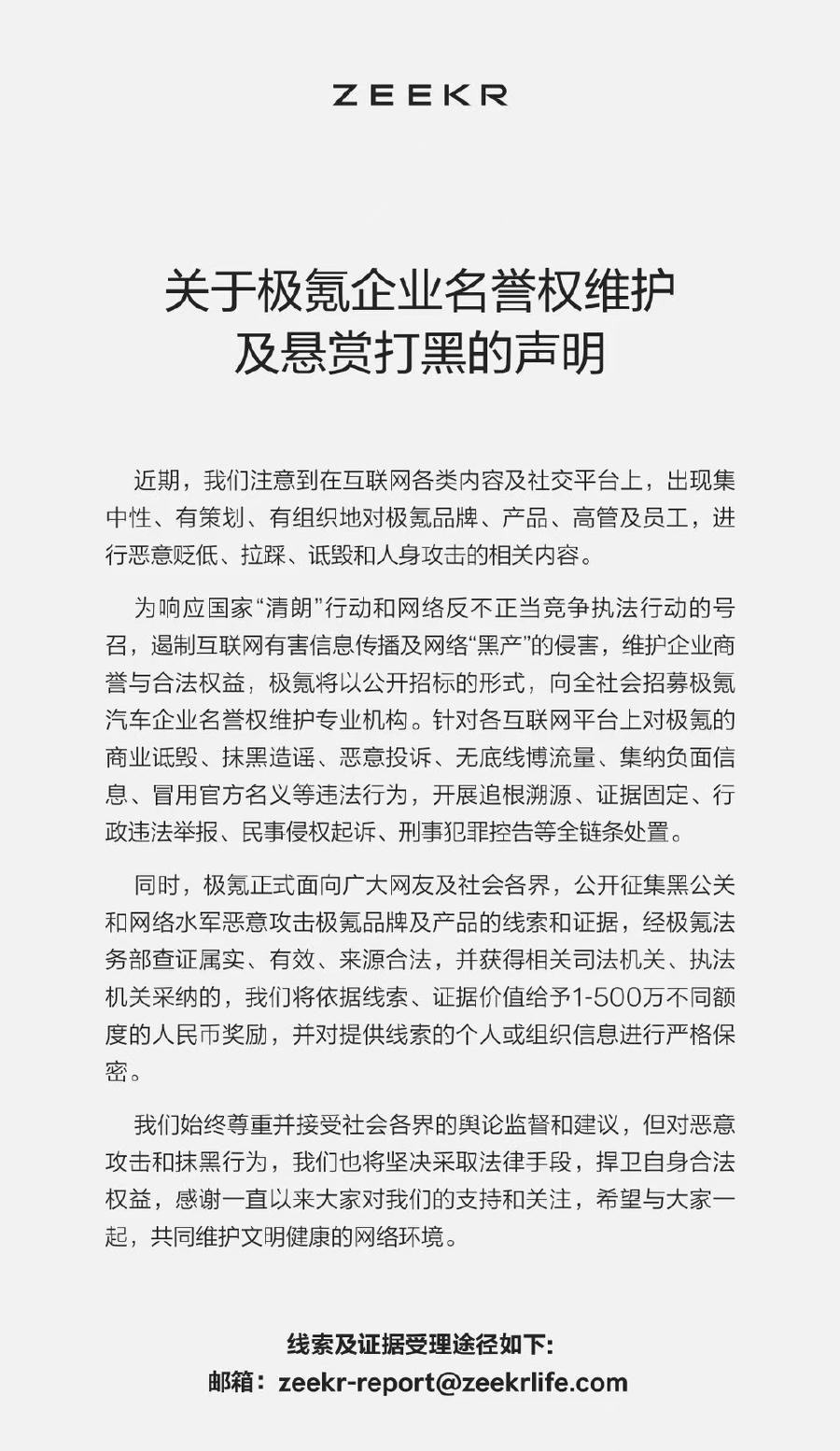 3月6日,极氪法务部发文表示:“为响应国家“清朗”行动,遏制互联网有害信息传播及网络“黑产”的侵害,维护自身合法权益,极氪向全社会招募企业名誉权维护专业机构合作,同时公开征集黑公关和网络水军的相关线索和证据,经查证属实、有效、来源合法,并最终采纳的,我们将给予1万-500万元不同额度的人民币奖励。”