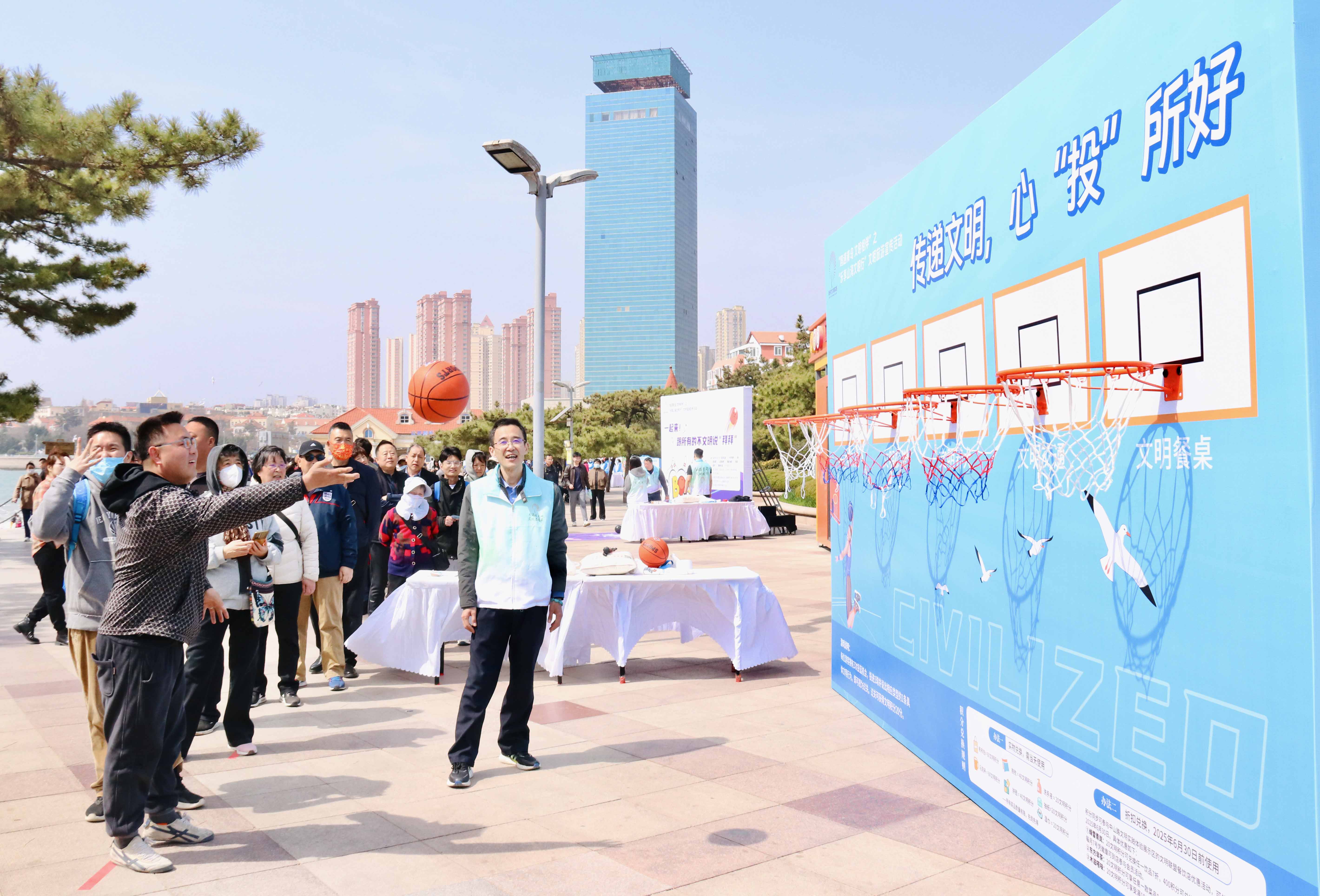 文明传递,心“投”所好。现场,百余名游客市民参与到“一起来!跟所有的不文明说拜拜”巨型保龄球游戏和文明投篮游戏中,承诺要杜绝“乱扔垃圾”“捕捉海鸥”“随地吐痰”等多个不文明行为。青岛市文明观鸥形象IP“鸥啦”全程陪伴,为践行文明行为的广大游客市民免费提供旅拍和纪念相框,助推活动持续实现文明理念的趣味化传播与沉浸式体验。