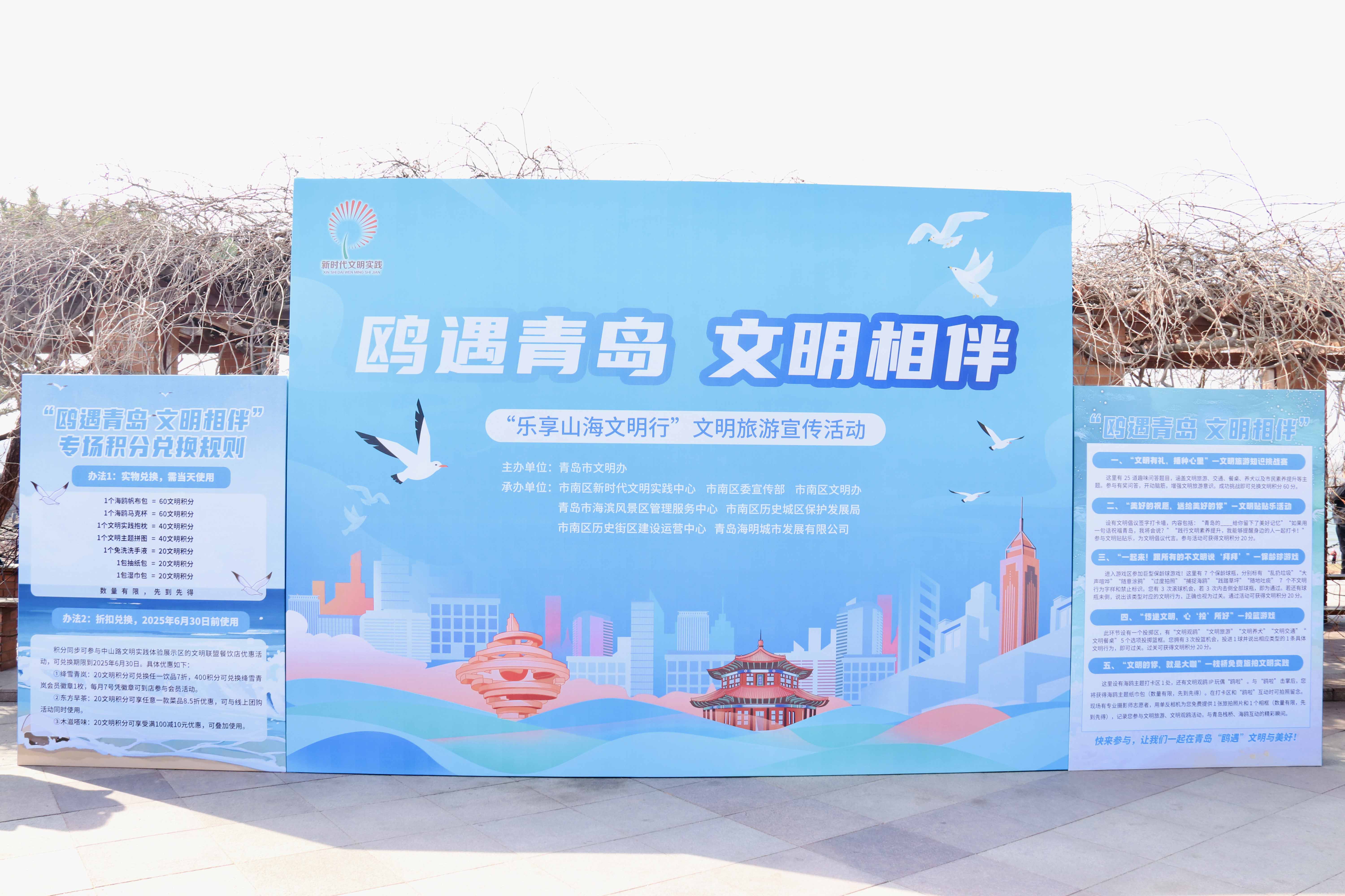 本次活动由青岛市文明办主办,由市南区新时代文明实践中心、市南区委宣传部、市南区文明办、青岛市海滨风景区管理服务中心、市南区历史城区保护发展局、市南区历史街区建设运营中心、青岛海明城市发展有限公司、交警市南大队、中山路街道办事处共同承办。活动将文明旅游、文明观鸥宣传巧妙融进青岛山海湾城,为倡导践行文明理念、营造和谐旅游环境、创新文明实践积分激励兑换方式、文明实践体验展示区建设做出有益探索。