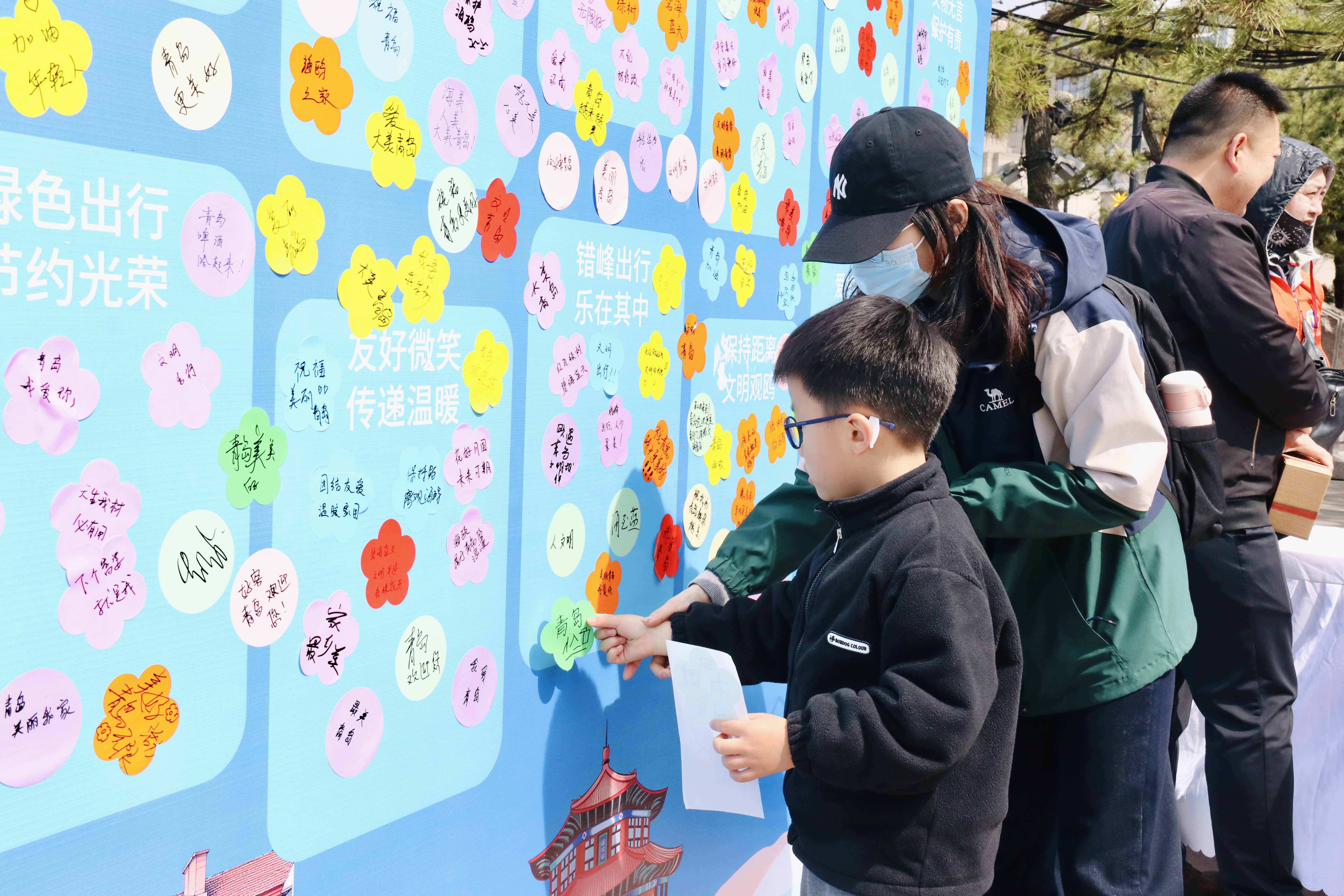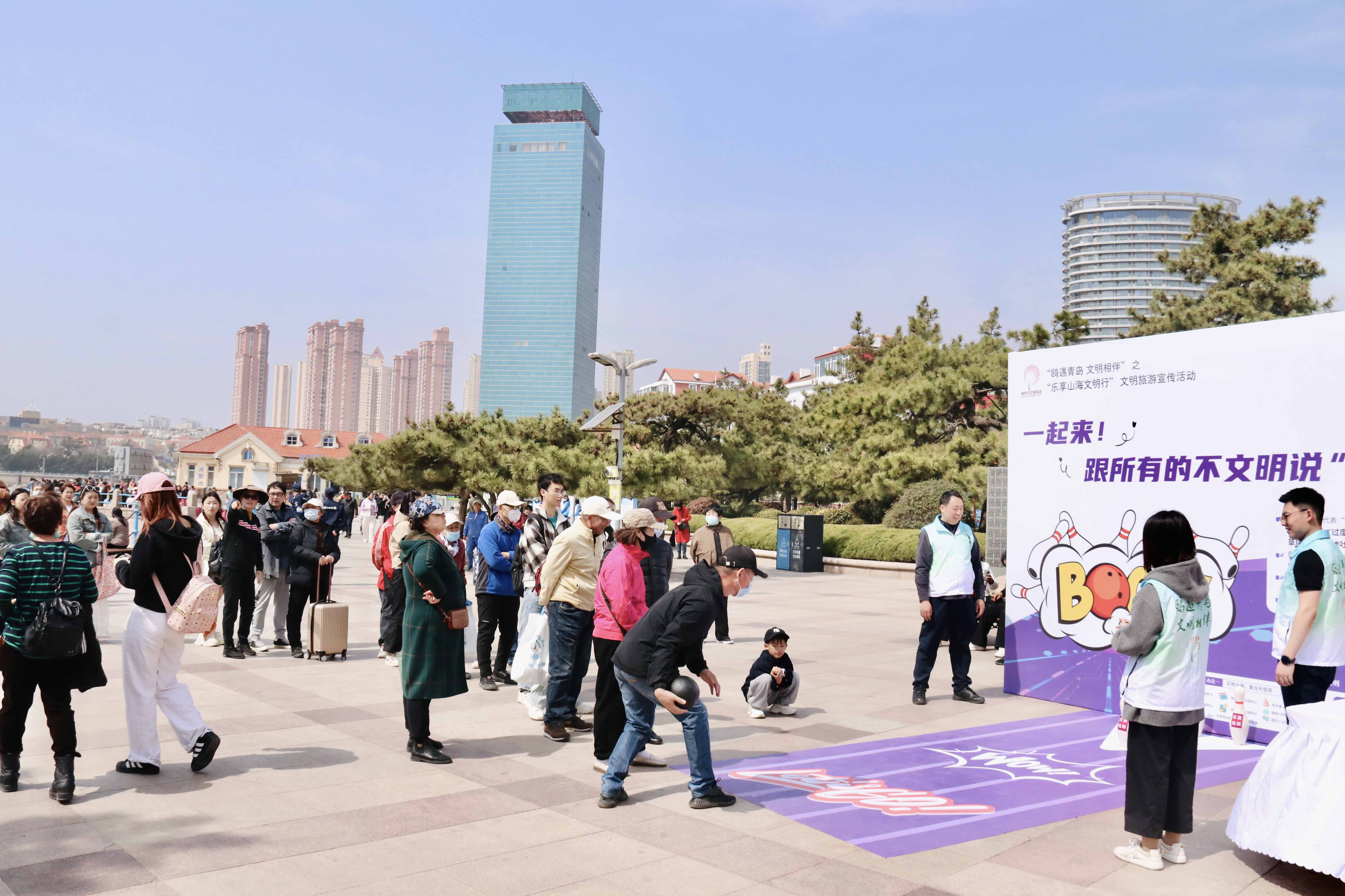 文明有礼,播种心里。活动伊始,一场生动有趣的文明旅游全民挑战赛吸引广大市民游客纷纷举手抢答,问答内容涵盖文明观鸥、文明出行、文明餐桌、文明养犬、新时代美德健康生活方式、美德信用等多个方面。文明贴贴乐环节则设立了最美旅人祝福墙,“文明有礼”“观鸥胜地”等词成为五湖四海游客对青岛的第一印象,“文明喂鸥”“避免抛食”等百余条文明旅游承诺贴在承诺墙上,成为广大市民游客这个春天里守护城市、践行文明最温暖的诺言。
