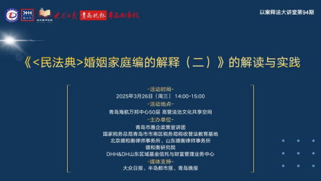 为了更好地解读并将其运用在婚姻家事诉讼案件的实践之中,3月26日下午,由青岛市惠企政策宣讲团、国家税务总局青岛市市南区税务局税收普法教育基地、北京德和衡律师事务所、山东德衡律师事务所、德和衡研究院、DHH&DH山东区域基金信托与财富管理业务中心共同主办“《<民法典>婚姻家庭编的解释(二)》的解读与实践”为主题的第94期“以案释法大讲堂”在德和德衡高管法治文化共享空间成功举办。