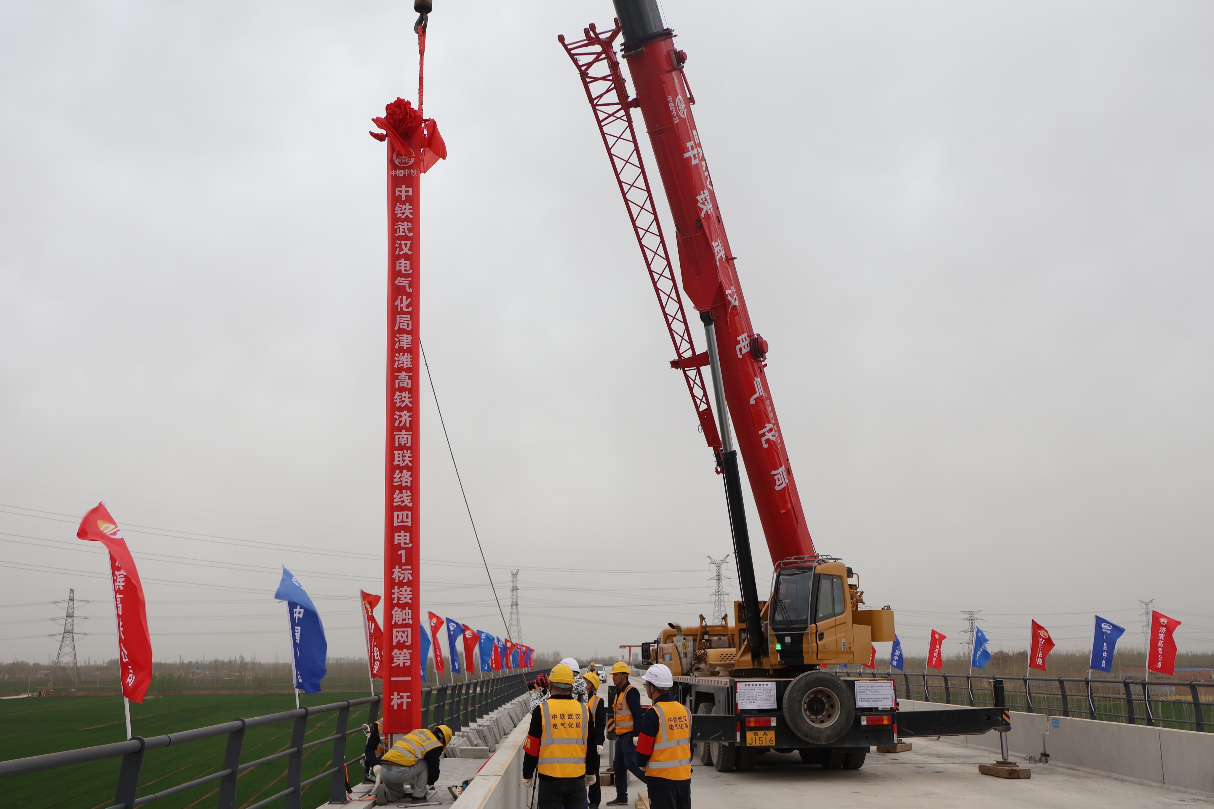 3月27日上午,在济南济阳,随着吊车精准地将首根H型钢柱吊装到指定位置,济滨高铁济南地区接触网第一杆在济商1号特大桥143号桥墩成功组立,标志着济滨高铁济南段四电工程施工全面启动。