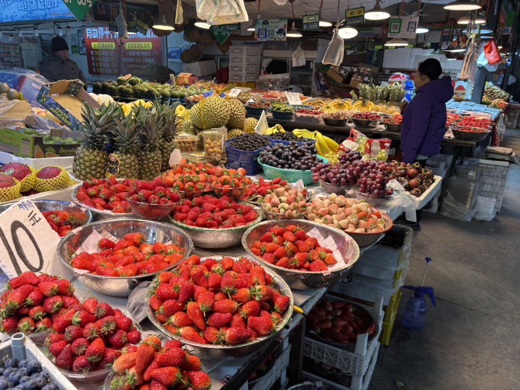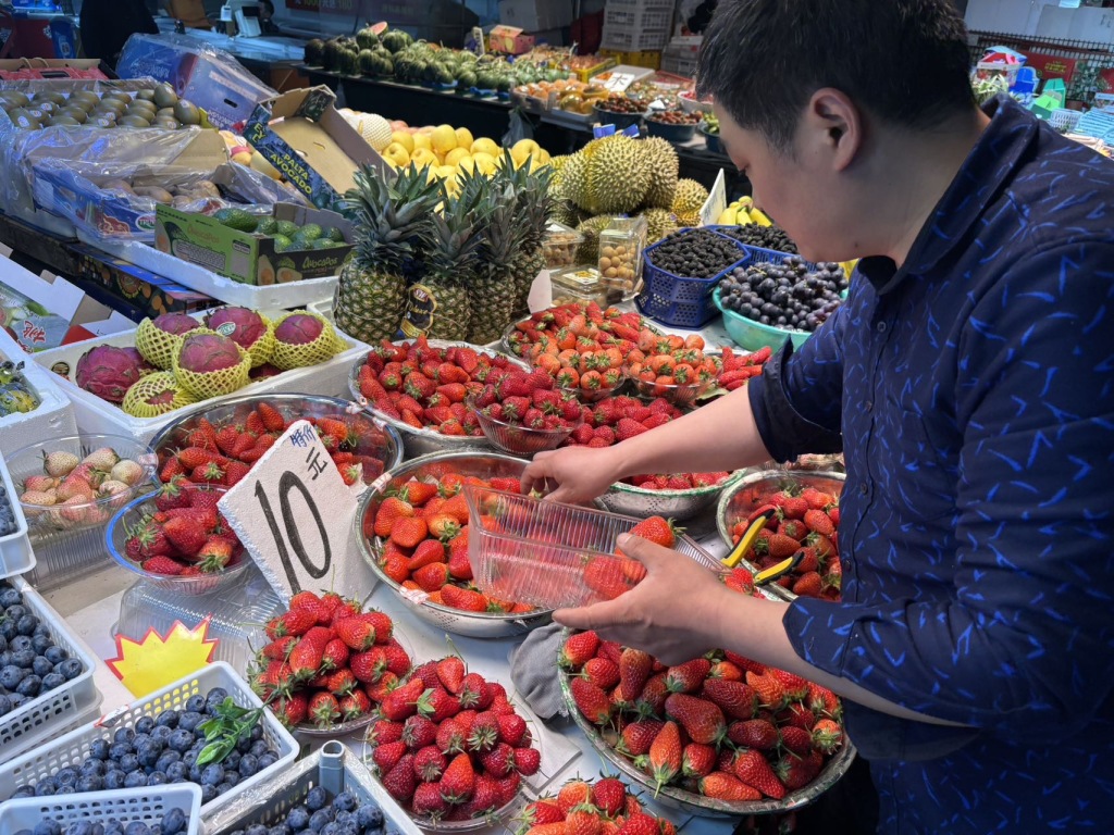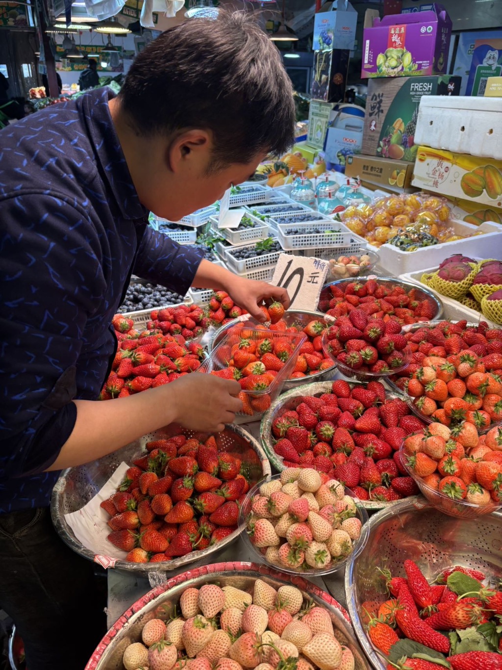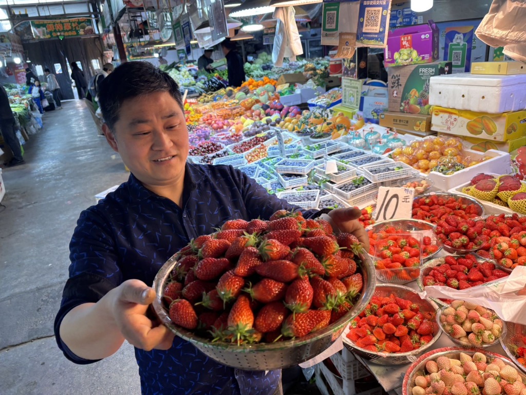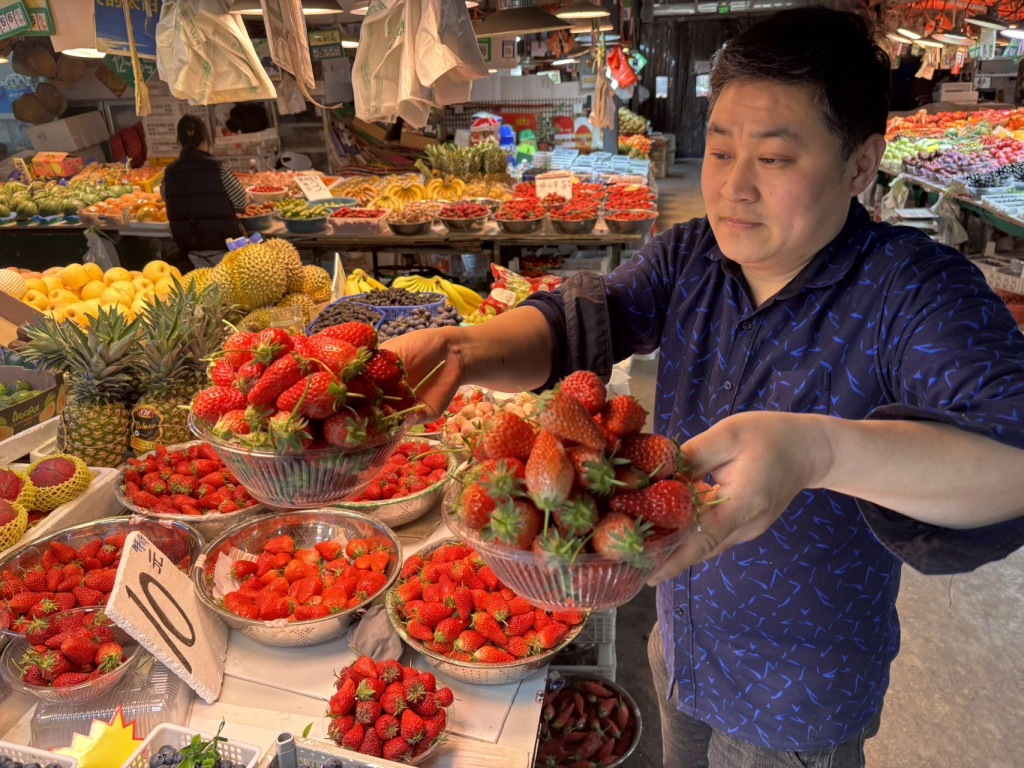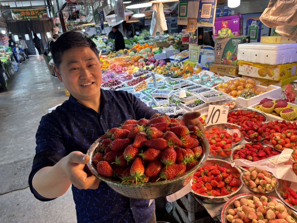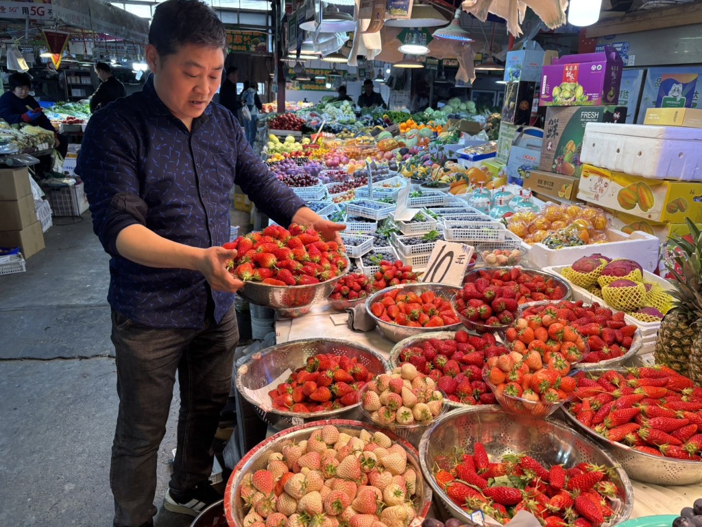 4月2日,青岛市北区埠西市场内,摊主黄师傅在整理刚运来草莓。售价根据个头大小,每斤在10元至15元之间。目前是吃草莓最佳季节,个头大、味道鲜美的本地草莓大量上市,深受市民的青睐。(半岛全媒体记者 何毅 )