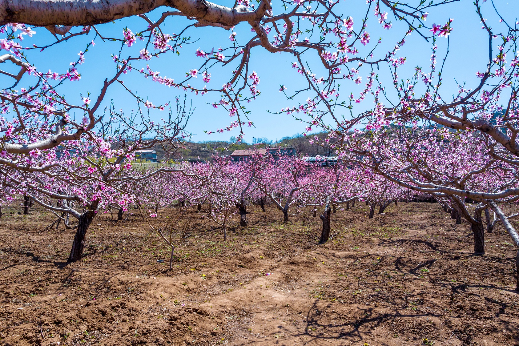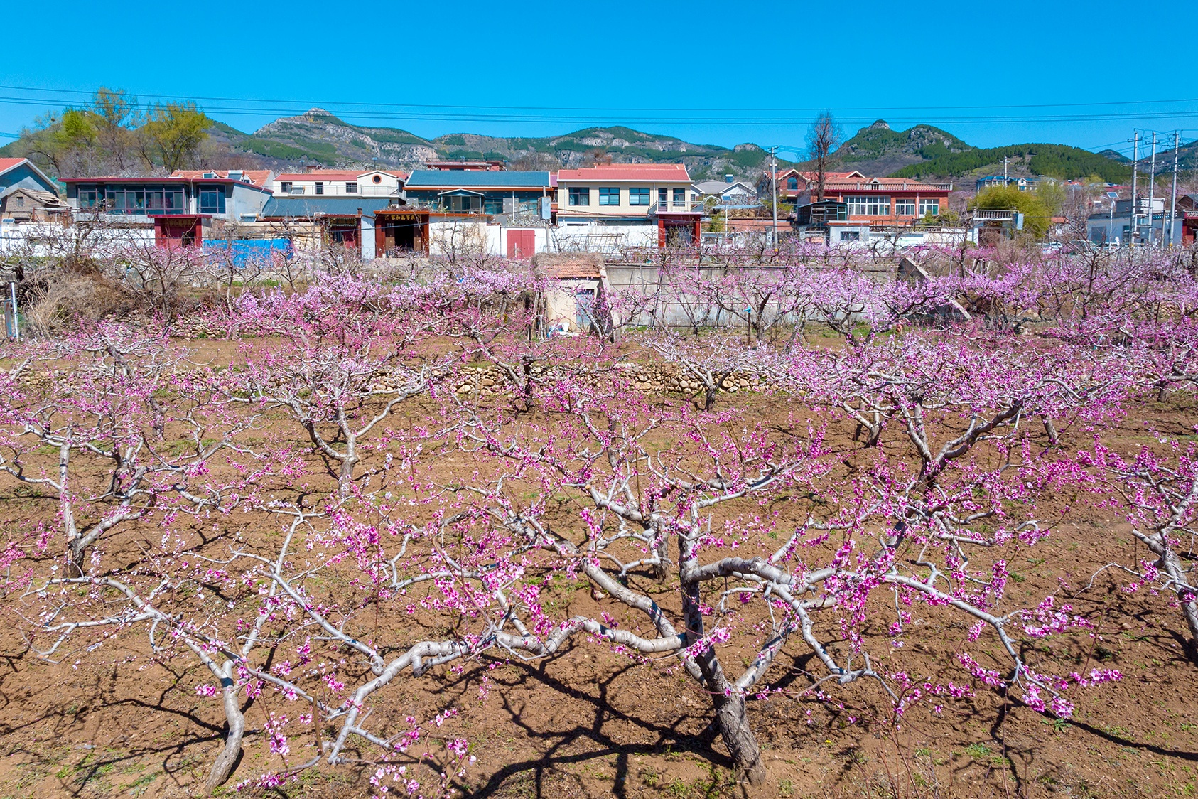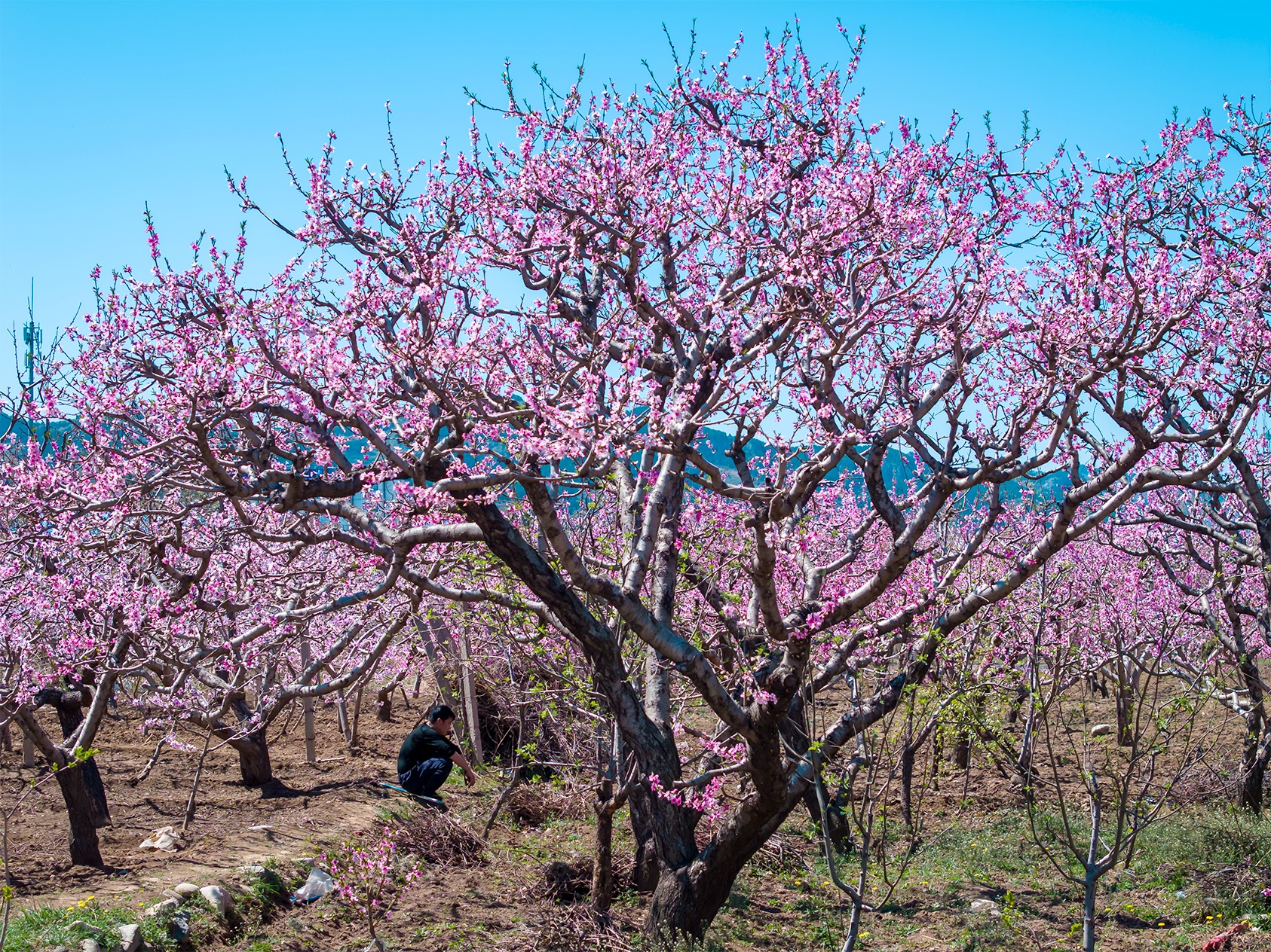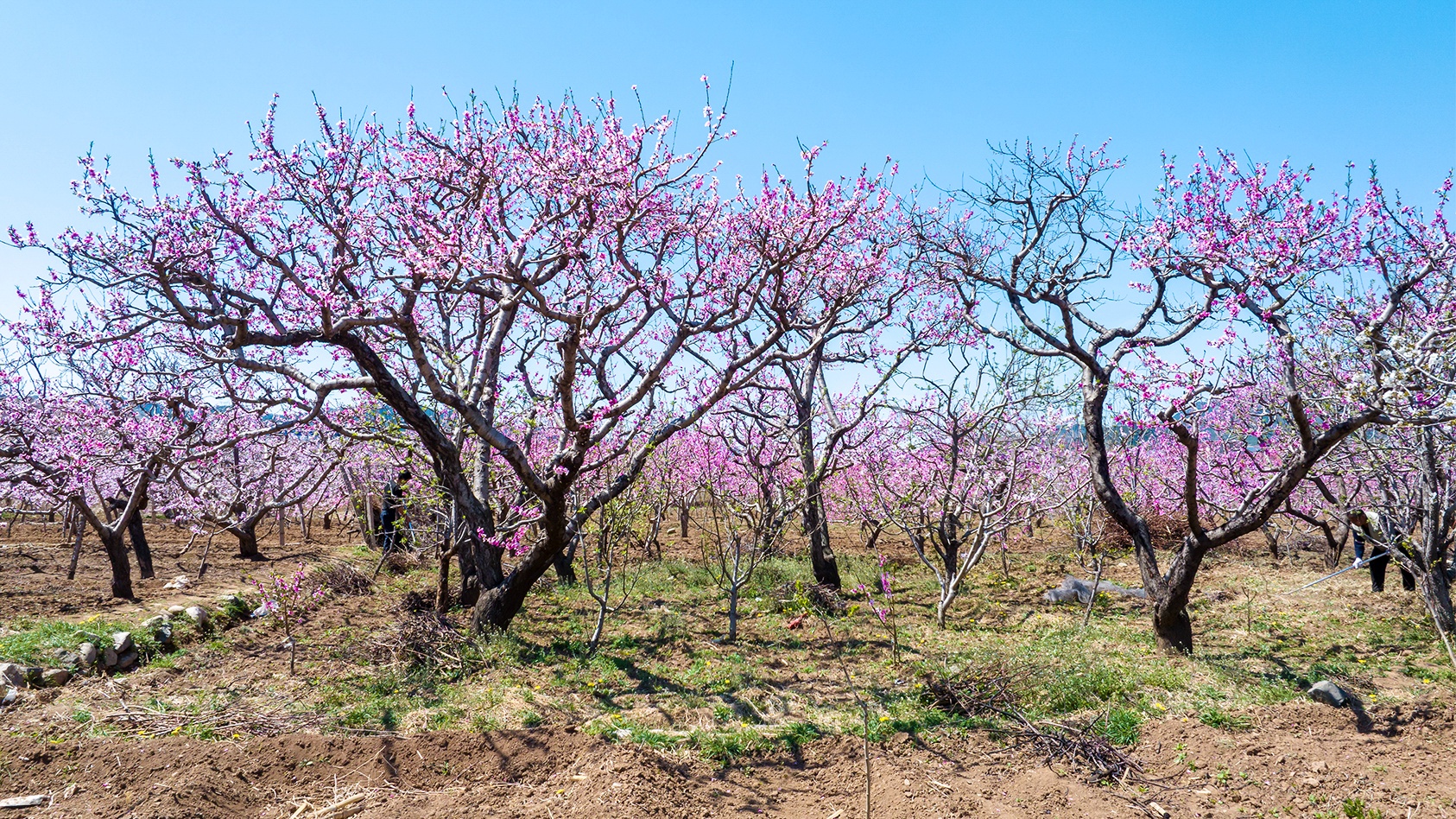 清明春游来到济南南山里的锦绣川水库,从大堤西望是一个偌大的花园。入园便是密密匝匝的桃树,弯弯曲曲的枝干上开满粉红色桃花,如绚丽的红霞;园的深处是梨花、樱桃花,洁白如玉,像覆了层白雪。