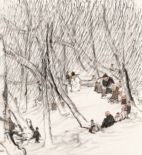 李学明是当代得传统写意人物画雅正之气的大家。李学明画路宽,山水、花鸟亦十分可观。其作品按题材大致分为四个系列:林泉坐忘、湖山放怀、念兹乡土、既耕春圃。每个系列又可分为不同层级的一级画科、二级画科甚至是三级画科。这诸多子系列,共同组成了一个完整而清晰的网状结构。重要的是,写意精神始终如灵魂一样引领着这个庞大的网状结构。在写意精神严重缺失甚至濒临绝境的当代语境中,李学明用自己的艺术实践推动传统大写意一脉向前发展。无疑,他对传统写意人物画发展是有贡献的。