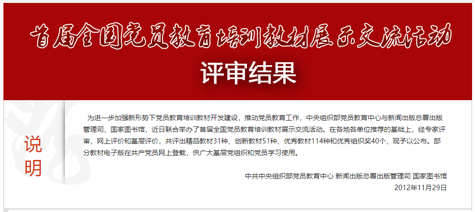 中共中央组织部党员教育中心与新闻出版总署出版管理司、国家图书馆于2012年联合举办了首届全国党员教育培训教材展示交流活动。在全国各地各单位推荐的基础上,经专家评审、网上评价和基层评价,《学习点亮人生》被评为“优秀教材”。