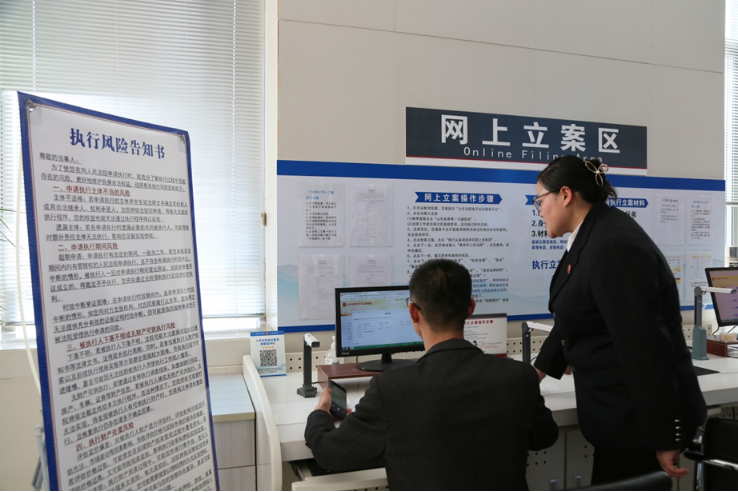 “这是咱们的执行风险告知书,里面详细写了执行过程中可能遇到的问题,您可以了解一下。”在莱州法院诉讼服务大厅网上立案区,引导员正在引导来立案的当事人提前了解执行风险。