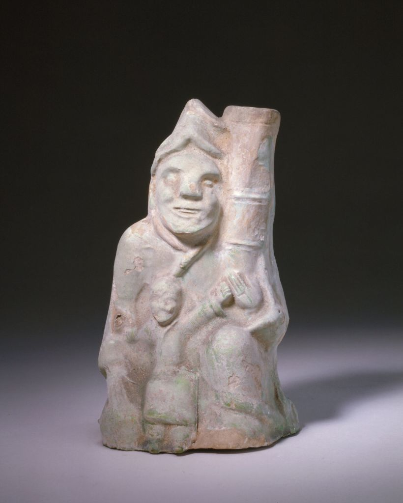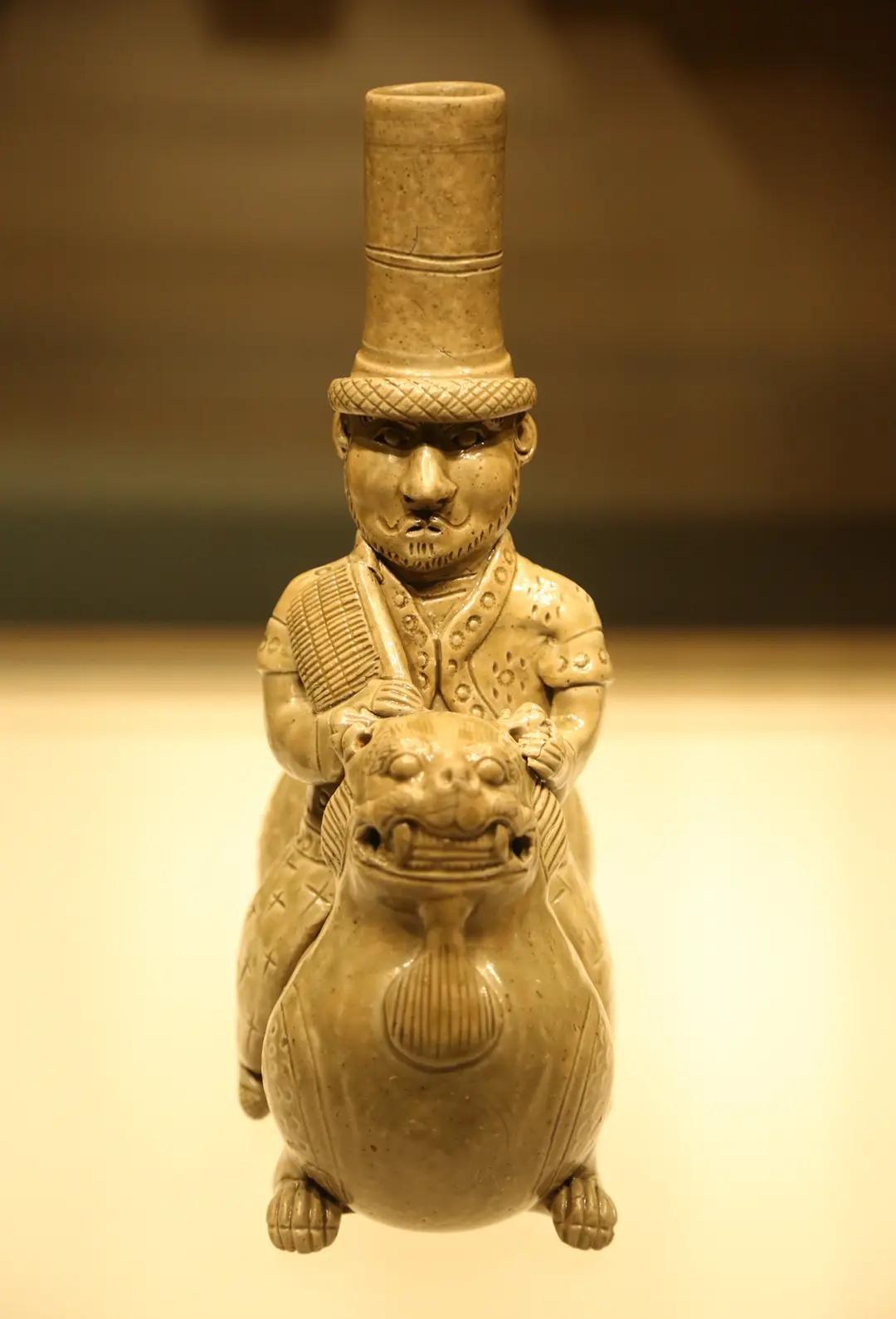 陶银绿釉胡神灯俑,东汉。俑深目高鼻,头戴尖顶帽,表明了其胡人的身份。 故宫博物院