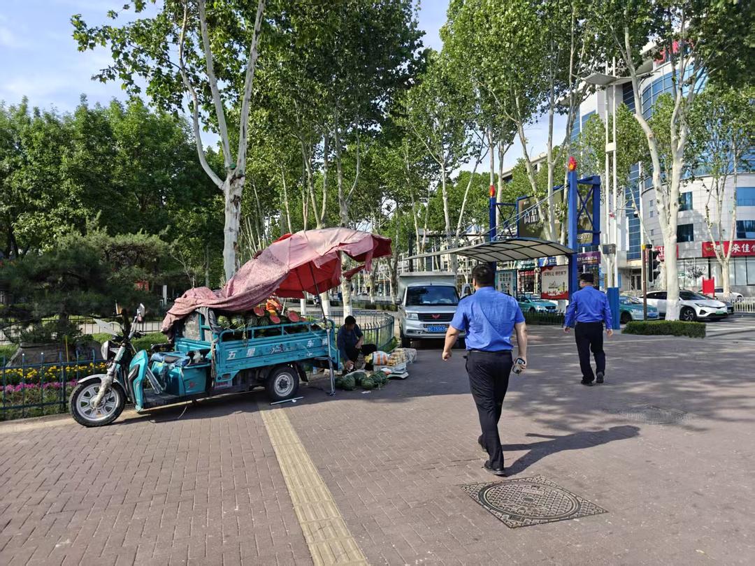 “老板,商品请归置店内,我们一起维护街面整洁!”在西五路商业街,执法队员以“柔性劝导+刚性执法”并举,督促商户落实“门前五包”责任制。五一期间,执法人员采取“集中整治+定点值守+徒步巡查”模式,对主干道、商圈、景区周边实施全天候管控,以“绣花功夫”为城市“梳妆打扮”。针对花山公园、九顶山等景区游客激增,增设“巡查专班”,以“劝导为主、疏堵结合”引导流动摊贩至便民摊点,既守护秩序又留住“烟火气”。