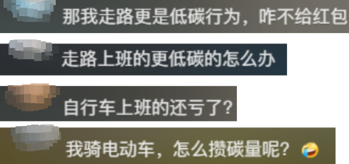 不过,一些网友也希望政策能够继续优化和完善:自己天天走路、骑自行车、骑电动车同样也是低碳行为,也是在为环保助力,不应该被遗忘。