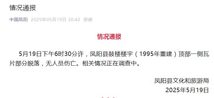 凤阳县文旅局于当日20时42分发布情况通报,明确此次瓦片脱落的具体时为19日下午6时30分许,脱落部位为凤阳县鼓楼楼宇(1995 年重建)顶部一侧,确认无人员伤亡,目前相关情况正在进一步调查中。