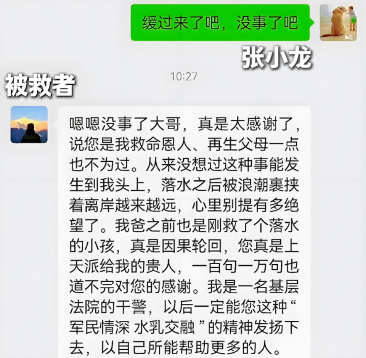 上岸后,张小龙简单抖了抖身上的海水,去看了下被救男子的情况并无大碍后,便要默默转身准备离开。此时,被救男子急忙上前表达感谢并请求添加微信,张小龙出于让对方安心的考虑,同意了这一请求。而面对大家的称赞,张小龙表示,作为一名现役军人,这是他义不容辞的责任,随后便悄然离去。