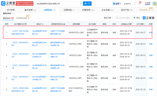 近日,哪吒汽车关联公司即合众新能源汽车股份有限公司新增一则股权冻结信息,该公司所持众联天下汽车销售服务有限公司20亿股权被冻结,冻结期自2025年6月27日至2028年6月26日。