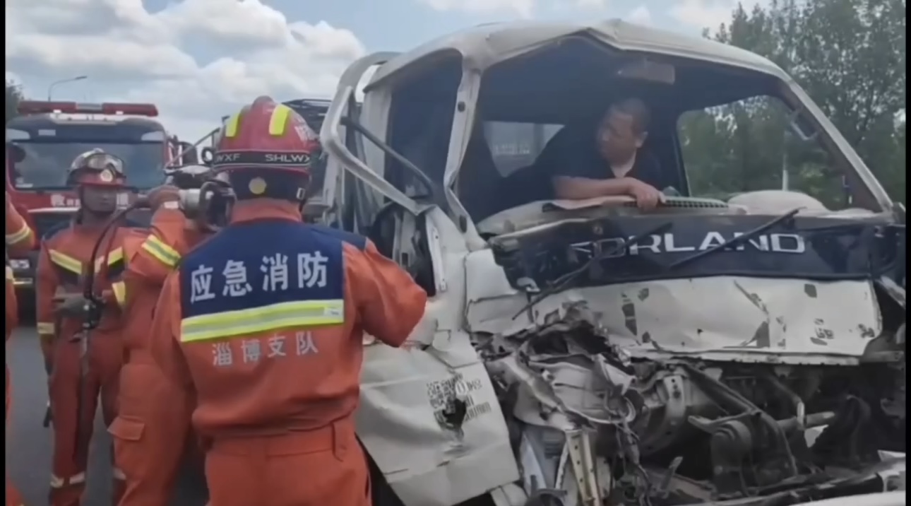 当天中午,淄博市消防救援支队接到报警后,立即调派2辆消防车、12名消防救援人员携带专业抢险救援装备赶赴现场。消防救援人员到达后发现,事故造成其中一辆车的车头和驾驶室严重变形,驾驶员被牢牢卡在驾驶座位上无法动弹。