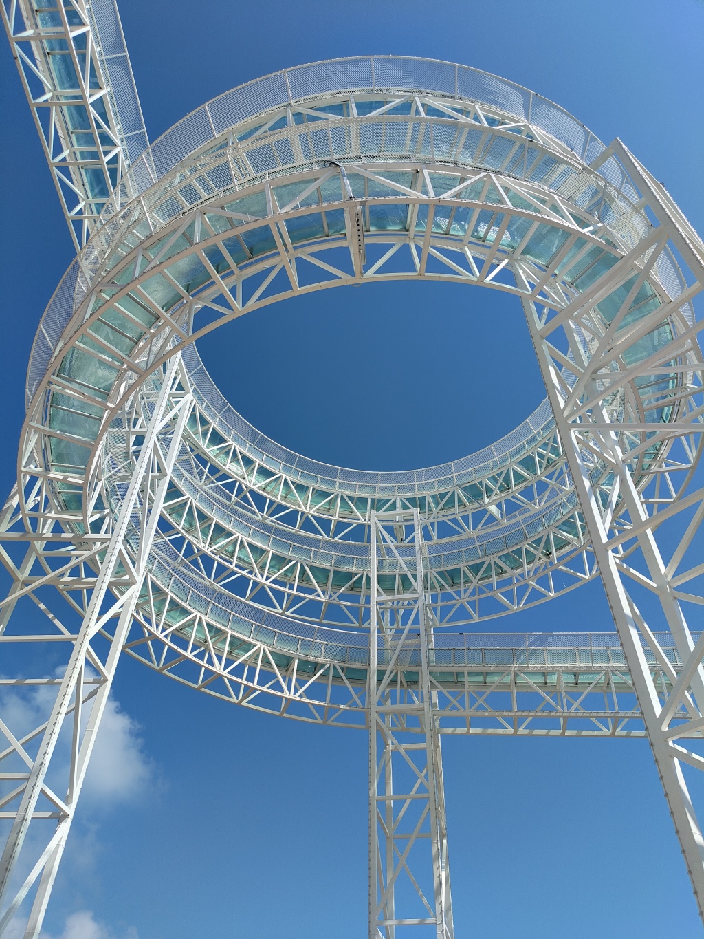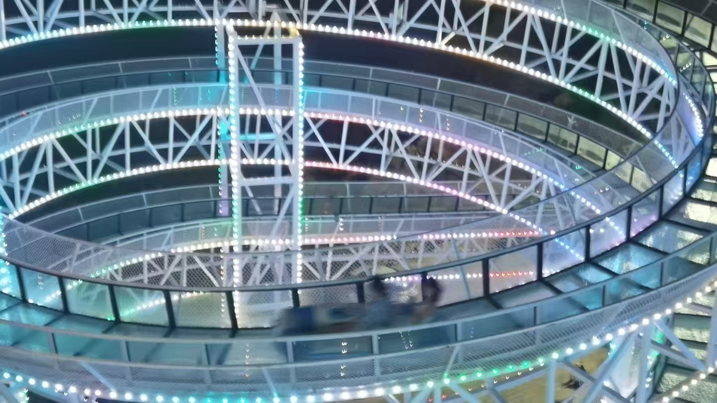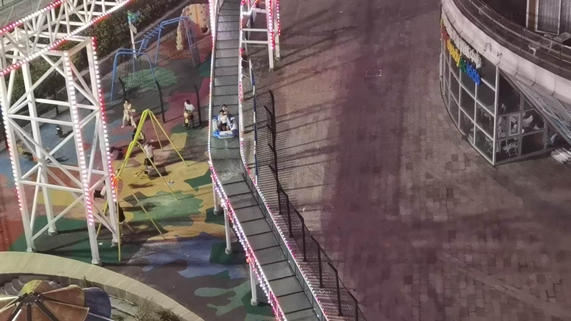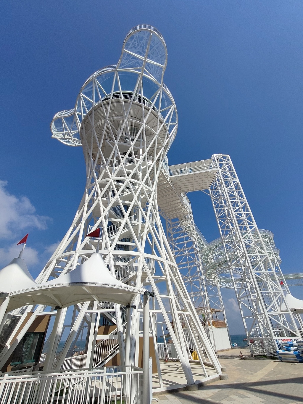 在每个拐弯处,都装上了安全防护网。近500米蜿蜒滑道,38米垂直落差,借助水力加速,体验从云端滑落时海风拂面的快感,将城市与大海尽收眼底。