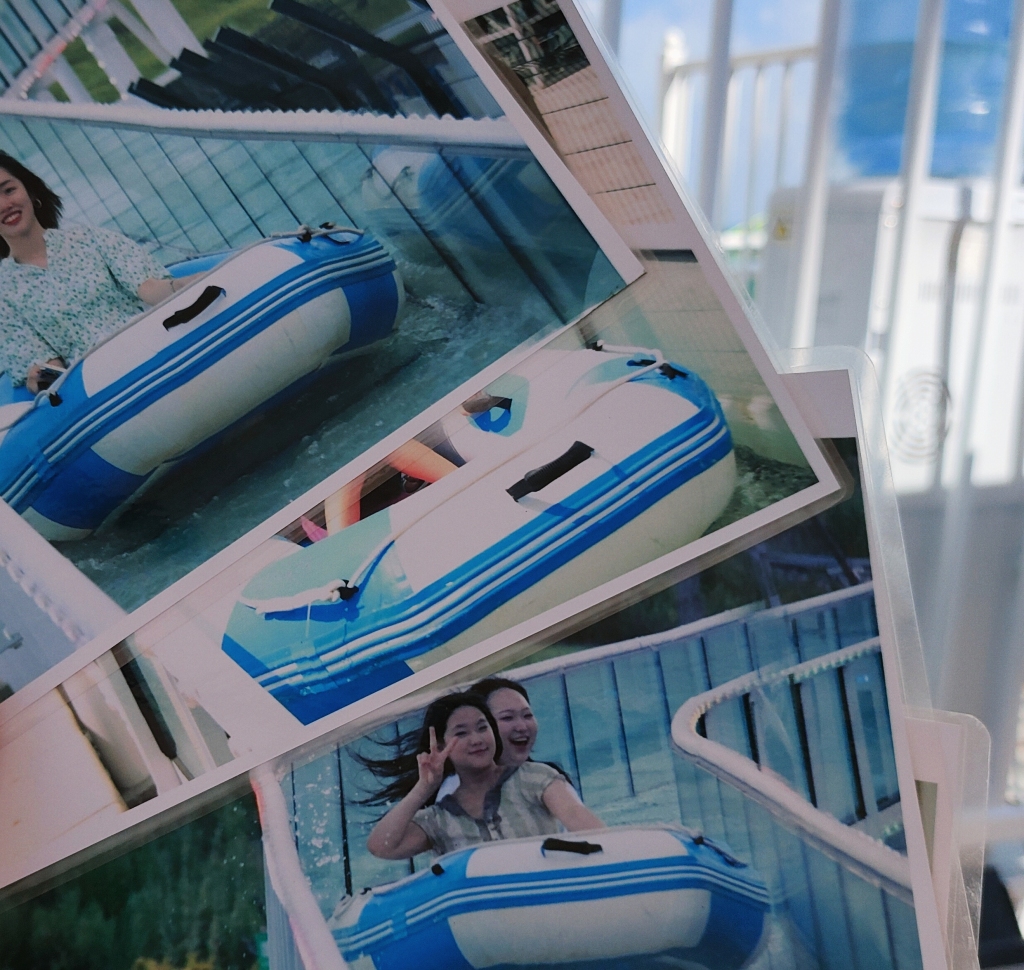 来到水滑道的尽头处,6名工作人员等候在这里,将滑下来的小船稳稳接住。现场还可以打印照片留念。走到出口,记者看到了很多游客打印出来的游玩照片,一张张灿烂的笑容跃然纸上。
