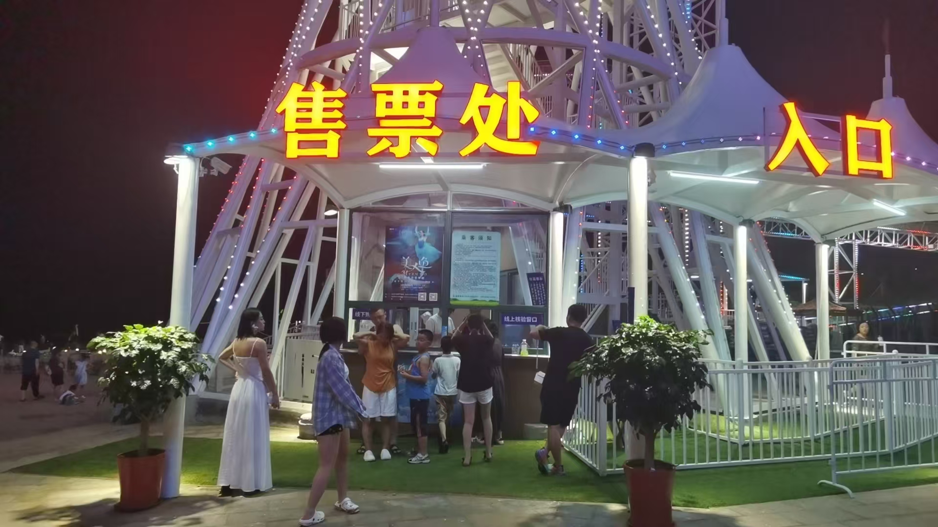 傍晚7点左右,太阳渐渐落下,“天空之镜”水滑道的游客就多了起来。3个检票员在入口处忙着检票、售票,1个保安负责疏散引导,维持秩序。