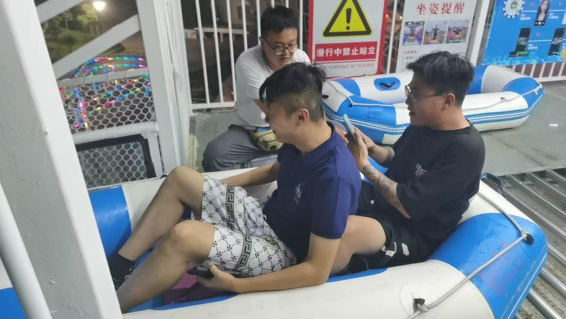 向下走到第四层,是水滑道的出发平台,游客们在这里排队等候,6名工作人员在这里装卸船。待游客平稳坐好,抓好扶手,检查无误后,工作人员用力将游客的小船推到水滑道中。