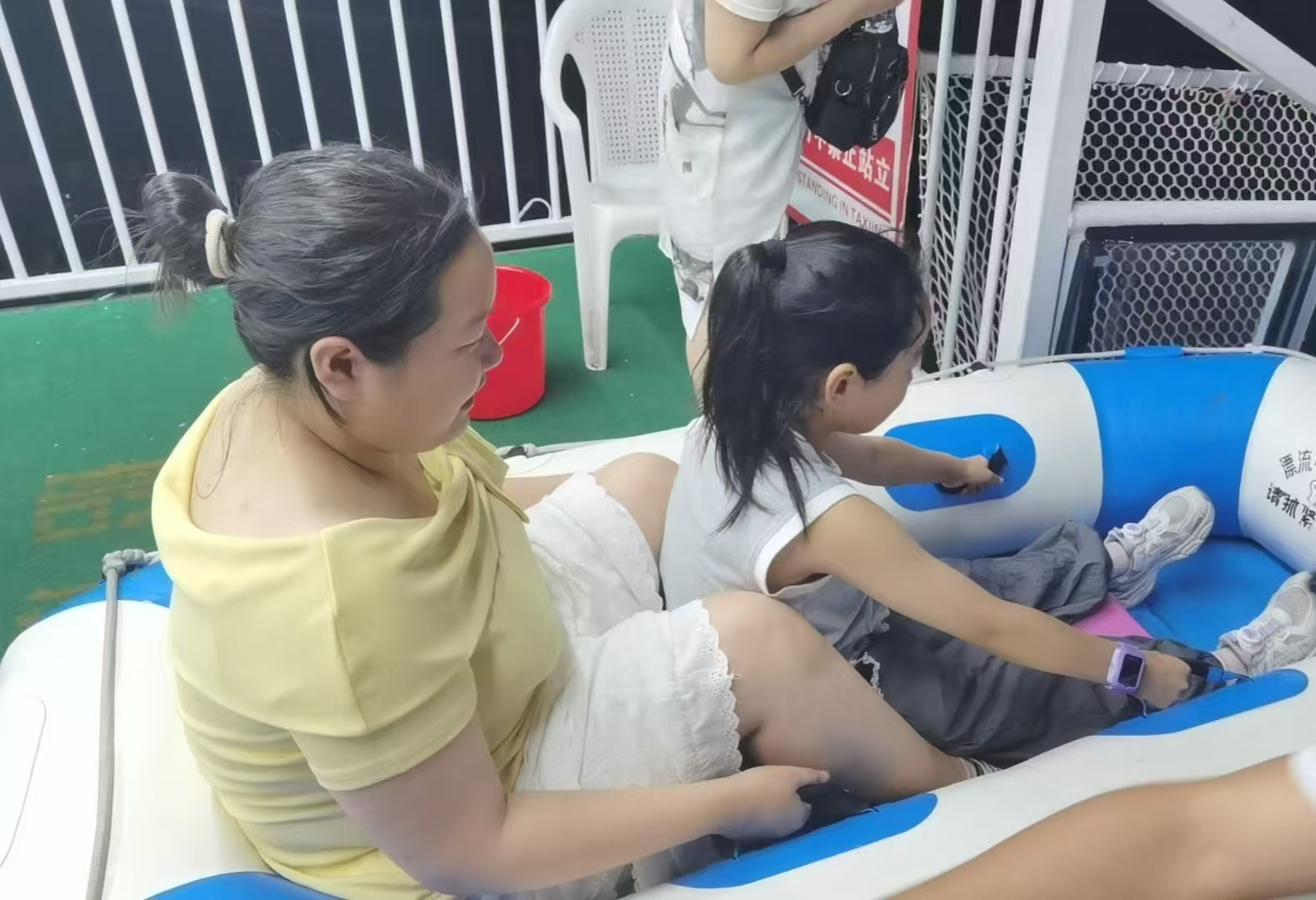 乘着小船顺流而下,可以看到水滑道的外围设置了不同的机位,帮助来体验的游客拍照,记录滑水的瞬间,也可以录制视频。