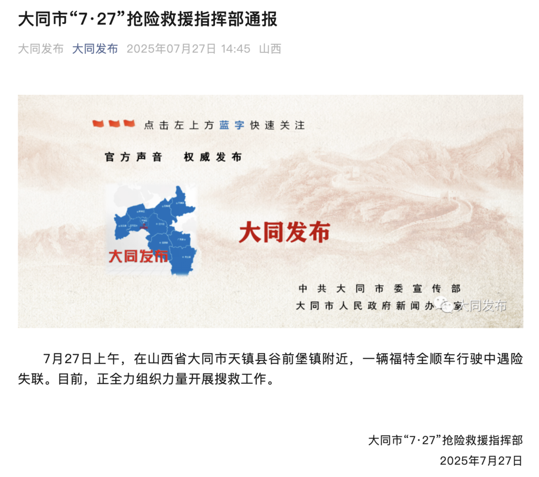据大同市“7·27”抢险救援指挥部消息,7月27日上午,在山西省大同市天镇县谷前堡镇附近,一辆福特全顺车行驶中遇险失联。目前,正全力组织力量开展搜救工作。