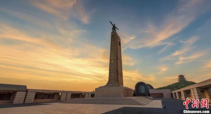 夕阳下的铁道游击队纪念碑。铁道游击队纪念馆供图