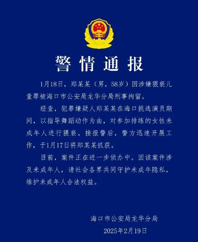 今年2月19日,海口市公安局龙华分局发布警情通报:1月18日,郑某某(男,58岁)因涉嫌猥亵儿童罪被海口市公安局龙华分局刑事拘留。经查,犯罪嫌疑人郑某某在海口挑选演员期间,以指导舞蹈动作为由,对参加排练的女性未成年人进行猥亵。接报警后,警方迅速开展工作,于1月17日将郑某某抓获。