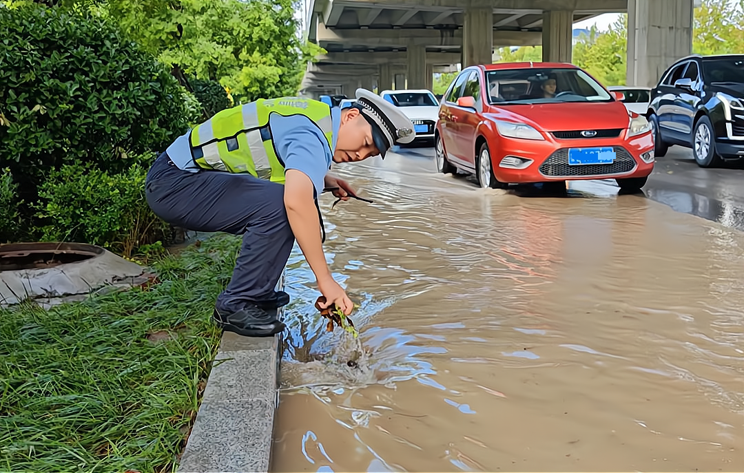 在积水较深的路段,交警们徒手清理排水口杂物加速排水,同时引导车辆绕行,确保道路通行顺畅。早高峰期间,执勤警力进一步加大管控力度,在各主要路口、学校、商圈周边指挥交通,及时疏导车辆,缓解交通压力。