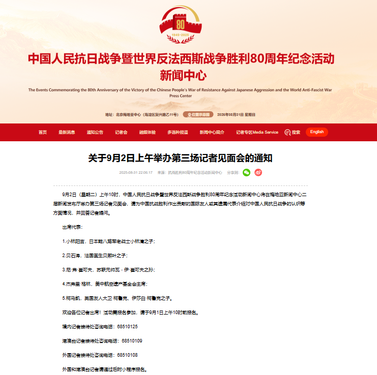9月2日(星期二)上午10时,中国人民抗日战争暨世界反法西斯战争胜利80周年纪念活动新闻中心将在梅地亚新闻中心二层新闻发布厅举办第三场记者见面会,请为中国抗战胜利作出贡献的国际友人或其遗属代表介绍对中国人民抗日战争的认识等方面情况,并回答记者提问。