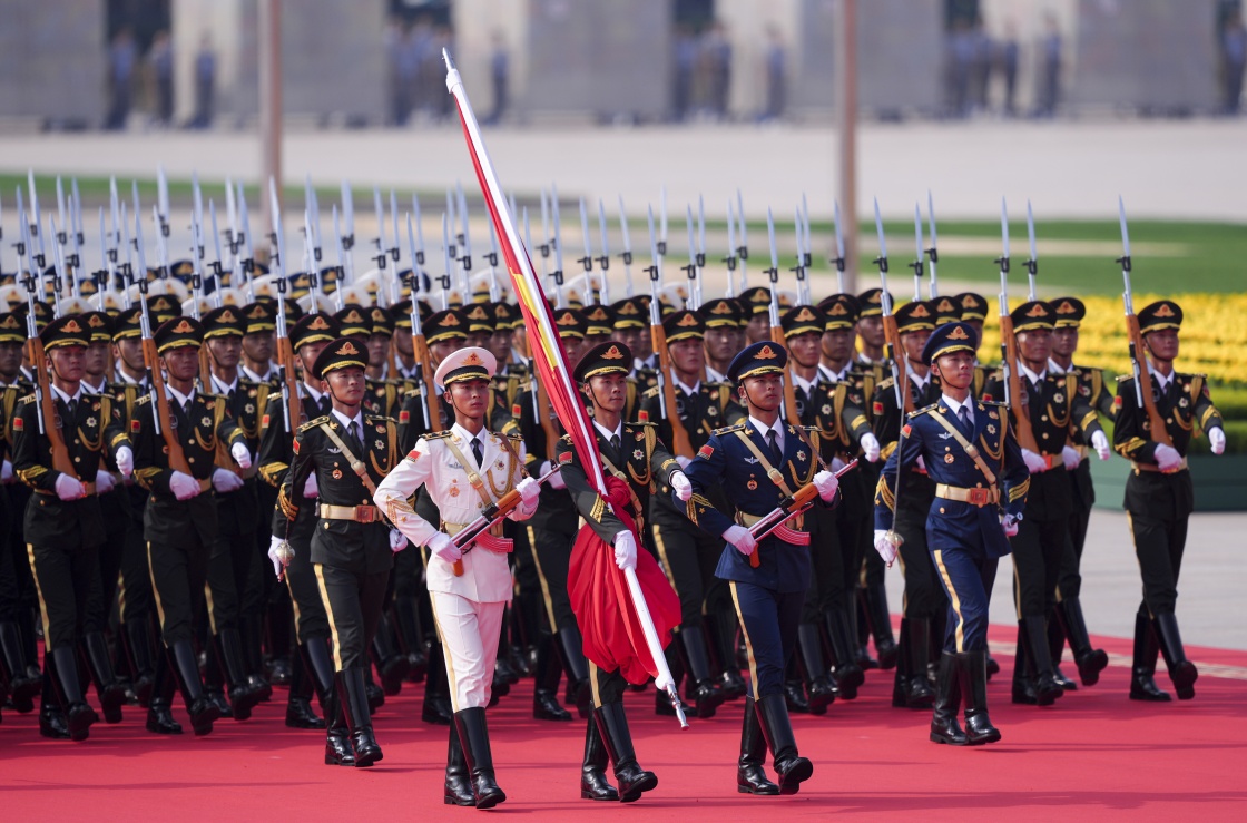 9月3日,纪念中国人民抗日战争暨世界反法西斯战争胜利80周年大会在北京隆重举行。这是国旗护卫队从人民英雄纪念碑基座出发,走向旗杆基座。