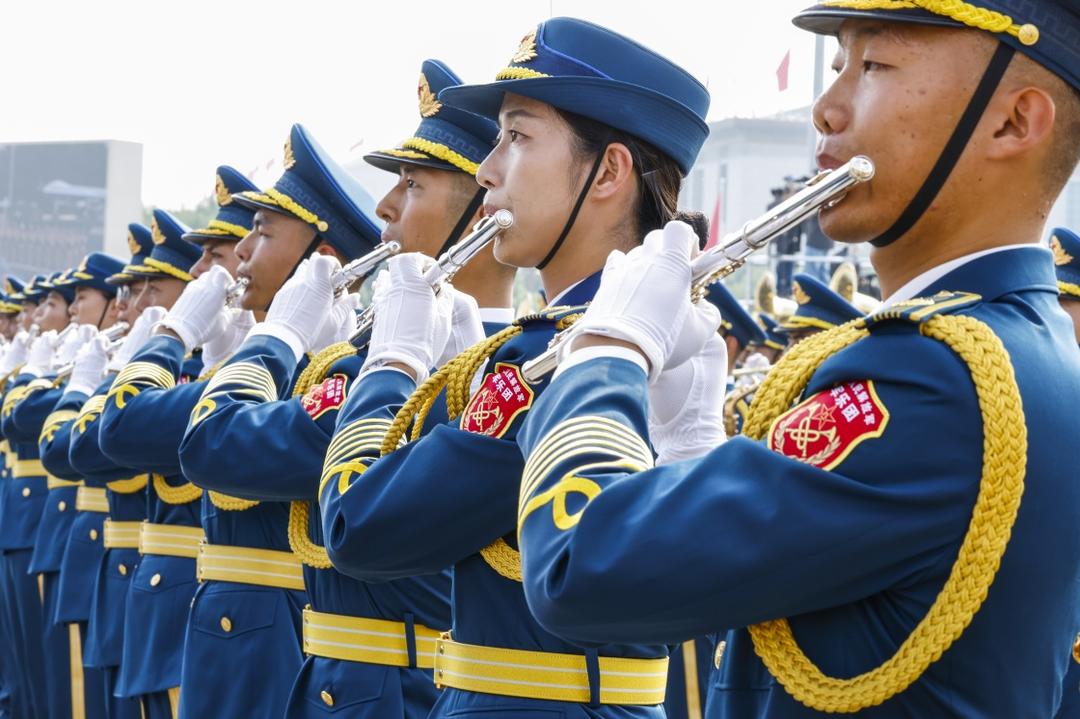 9月3日,纪念中国人民抗日战争暨世界反法西斯战争胜利80周年大会在北京隆重举行。这是中国人民解放军联合军乐团在演奏。
