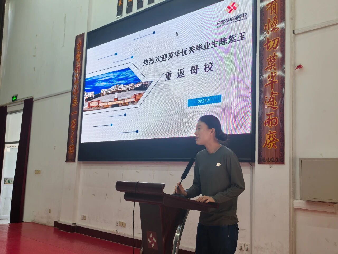 在完成“九三”阅兵任务后,陈紫玉回到东营稍作休息调整,受邀回到高中母校东营英华园学校,与师生分享自己的阅兵经历与成长感悟。她生动讲述了在天安门广场接受祖国和人民检阅的荣耀时刻,以及历时192天艰苦训练的心路历程,并结合自身从高中毕业生到军人、再从退役军人到研究生的成长轨迹,鼓励学弟学妹们坚定理想信念,勇于追逐梦想。