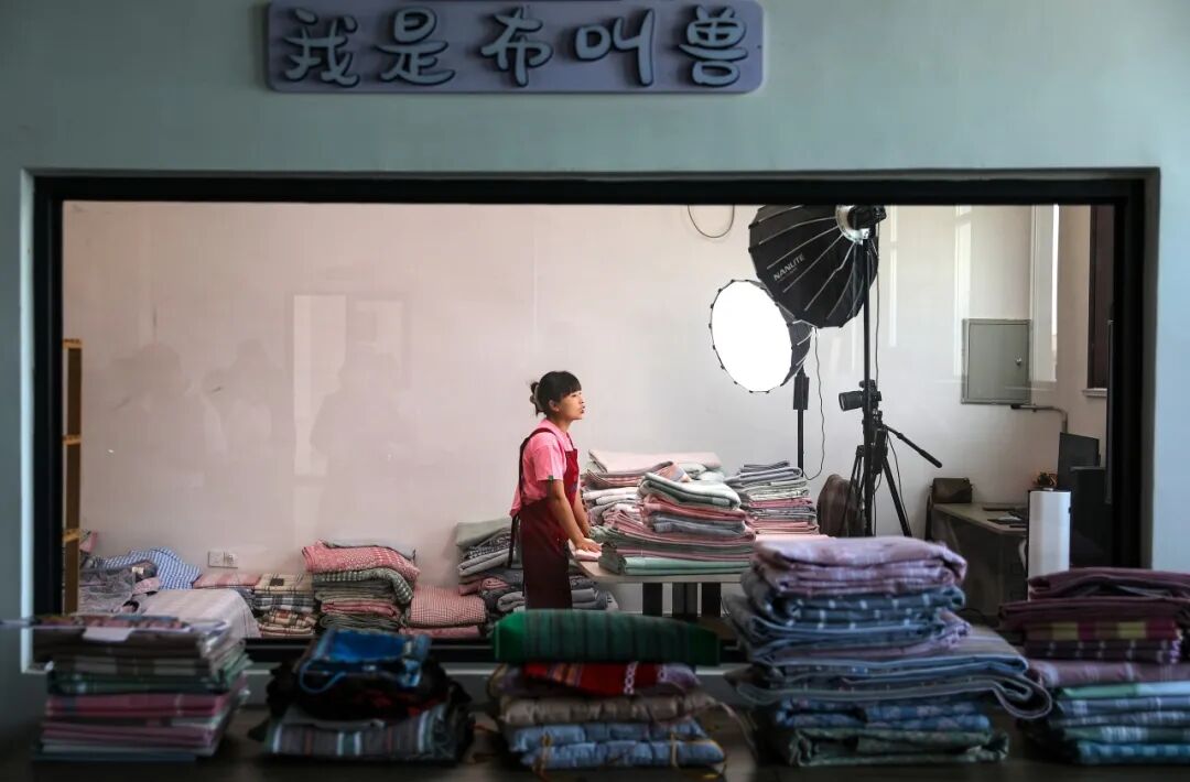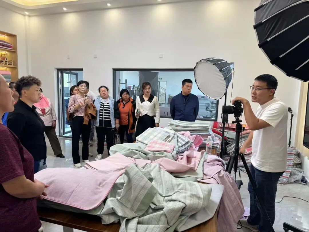 返乡后的刘越,没有盲目守旧。他敏锐察觉到电商浪潮的机遇,2015年率先带领团队开启“非遗+互联网”的转型尝试。初期的困难远超预期:团队缺乏线上运营经验,淘宝店铺流量寥寥,产品详情页因不懂设计而显得粗糙,首月线上销售额不足千元。“别人能做好,我们也能!”刘越不服输,白天跟着织女学织布、懂工艺,晚上熬夜研究平台规则,从产品拍摄、文案撰写到客户沟通亲力亲为,甚至自己当模特拍摄产品图。2019年,直播电商兴起,他又组建6人小团队“试水”,创新推出“技艺展示+文化科普”直播模式——邀请村里的织女走进直播间,现场演示搓布绩、纺线、染线等72道工序,同步讲解鲁西北“姑娘陪嫁老粗布”的民俗故事。