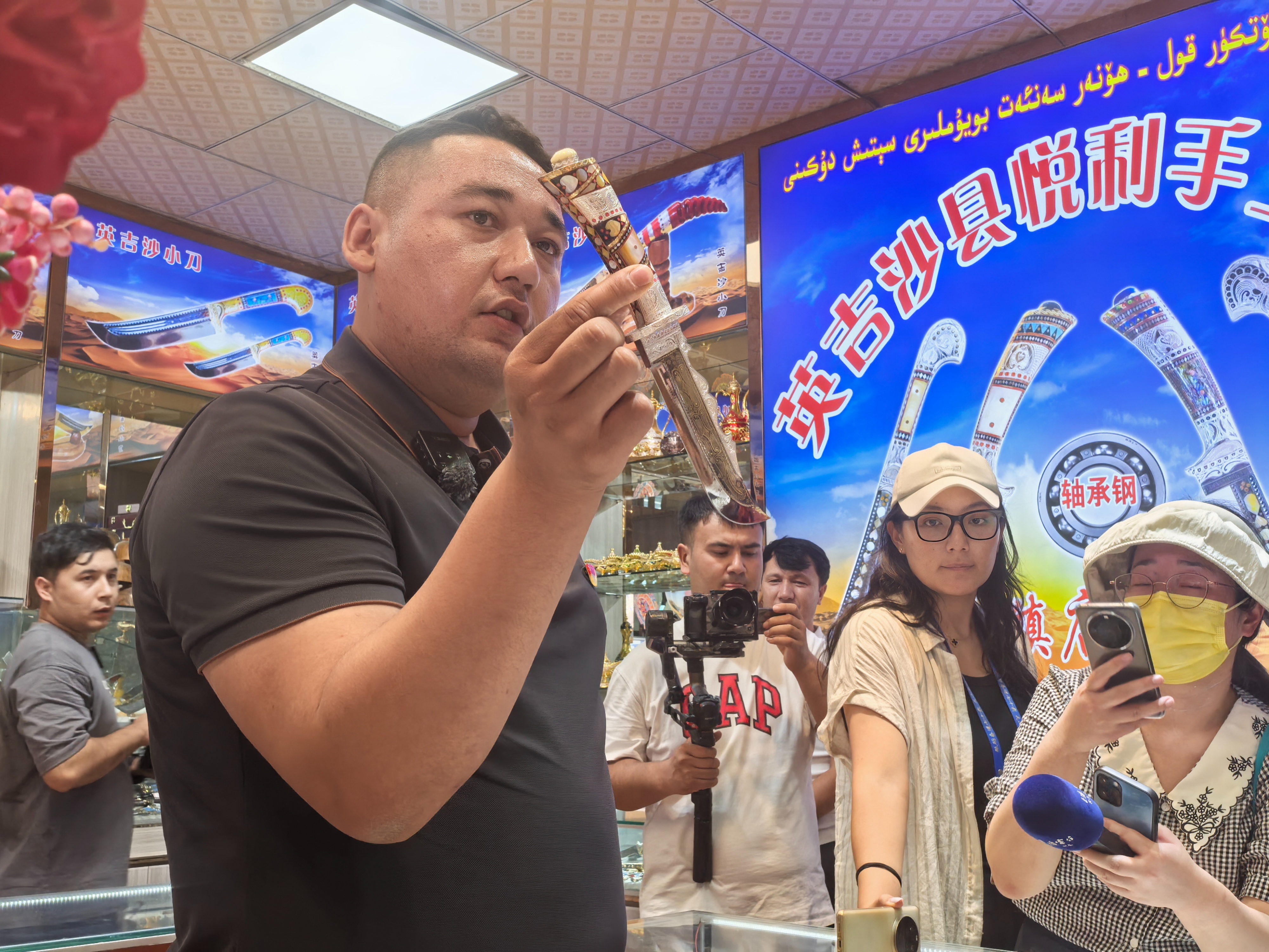 小刀村不少沿街店铺是售卖小刀的。英吉沙县悦利手工艺品制作店商户阿卜杜萨塔尔·毛拉木今年25岁。2022年,从新疆农业大学毕业后,他就回到家乡创业,经营了2家小刀店铺。“一年大概能卖出1万把小刀,销售收入在100万左右。”阿卜杜萨塔尔·毛拉木说。