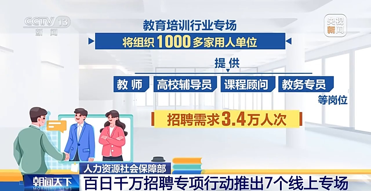 人工智能行业专场将组织1300多家用人单位,提供人工智能产品经理、算法工程师、数据开发工程师、风控建模工程师等岗位,招聘需求1.5万人次。教育培训行业专场将组织1000多家用人单位,提供教师、高校辅导员、课程顾问、教务专员等岗位,招聘需求3.4万人次。