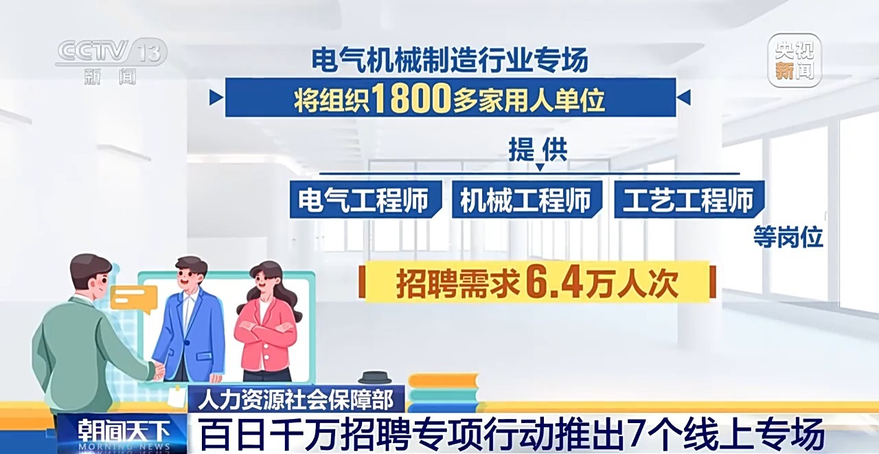 新能源行业专场将组织600多家用人单位,提供风电定检工程师、运维工程师、光伏工程师等岗位,招聘需求1.7万人次。电气机械制造行业专场将组织1800多家用人单位,提供电气工程师、机械工程师、工艺工程师等岗位,招聘需求6.4万人次。