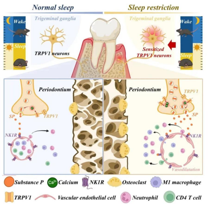 每晚睡眠少于4小时的人群,其牙周炎加重的风险明显增加。2025年《美国科学院院刊》刊发的研究发现,睡眠不足会通过“神经-血管-免疫轴”,造成口腔牙周炎疾病加重。